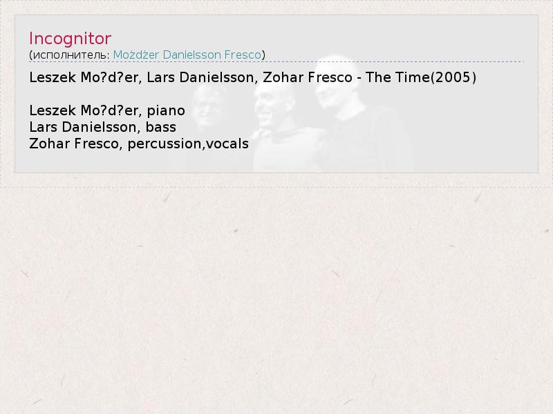 Это интересно:польско-шведско-израильское джазовое трио.Leszek Możdżer pianoLars Danielsson double bass, celloZohar Fresco percussion, vocals