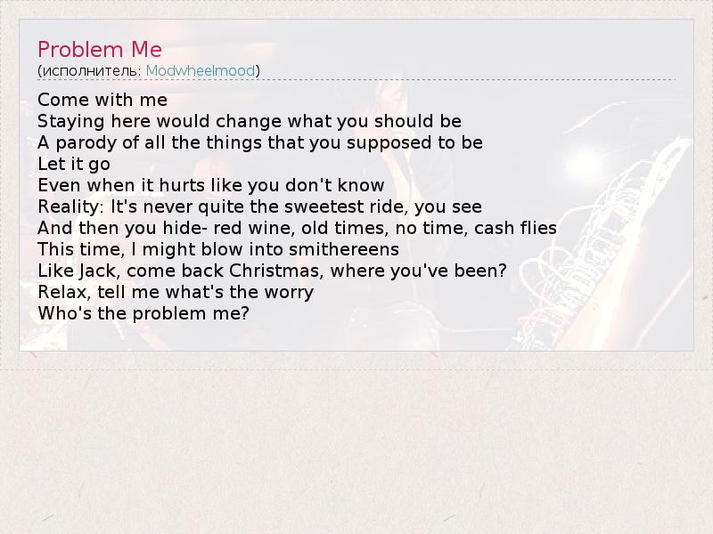 Come with me Staying here would change what you should be A parody of all the things that you supposed to be Let it go Even when it hurts like you don't know Reality: It's never quite the sweetest ride, you see And then you hide- red wine, old times, no time, cash flies This time, I might blow into smithereens Like Jack, come back Christmas, where you've been? Relax, tell me what's the worry Who's the problem me?
