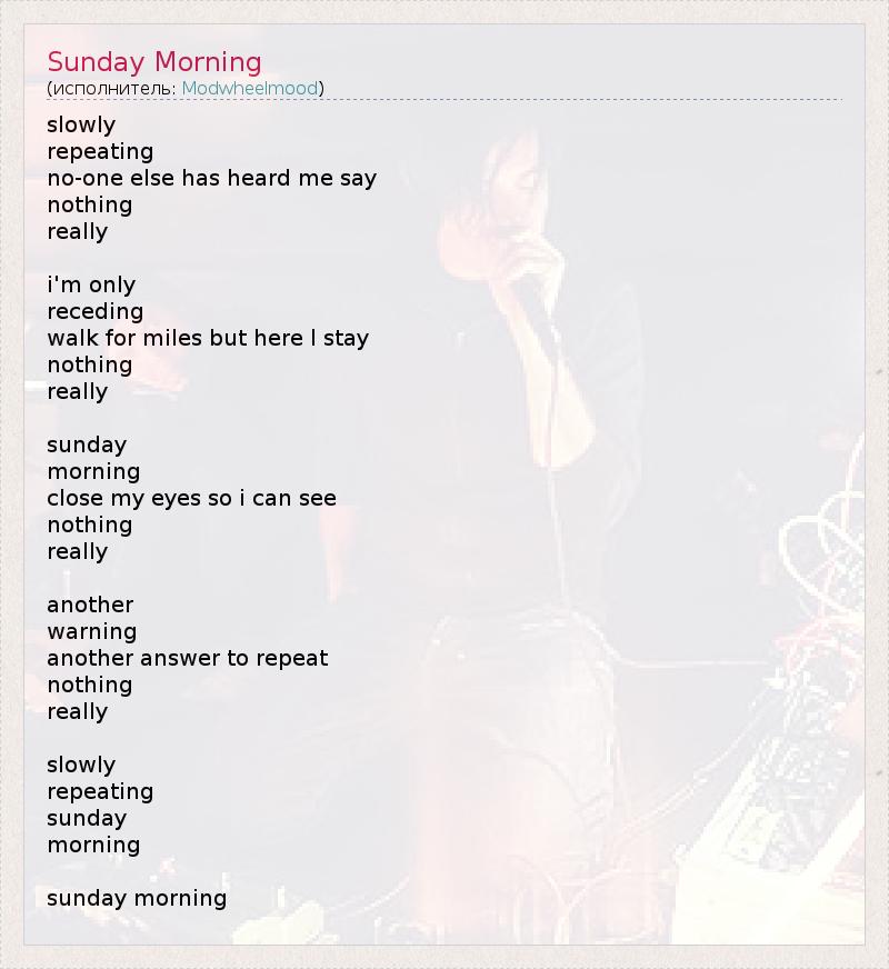 slowly repeating no-one else has heard me say nothing really i'm only receding walk for miles but here I stay nothing really sunday morning close my eyes so i can see nothing really another warning another answer to repeat nothing really slowly repeating sunday morning sunday morning