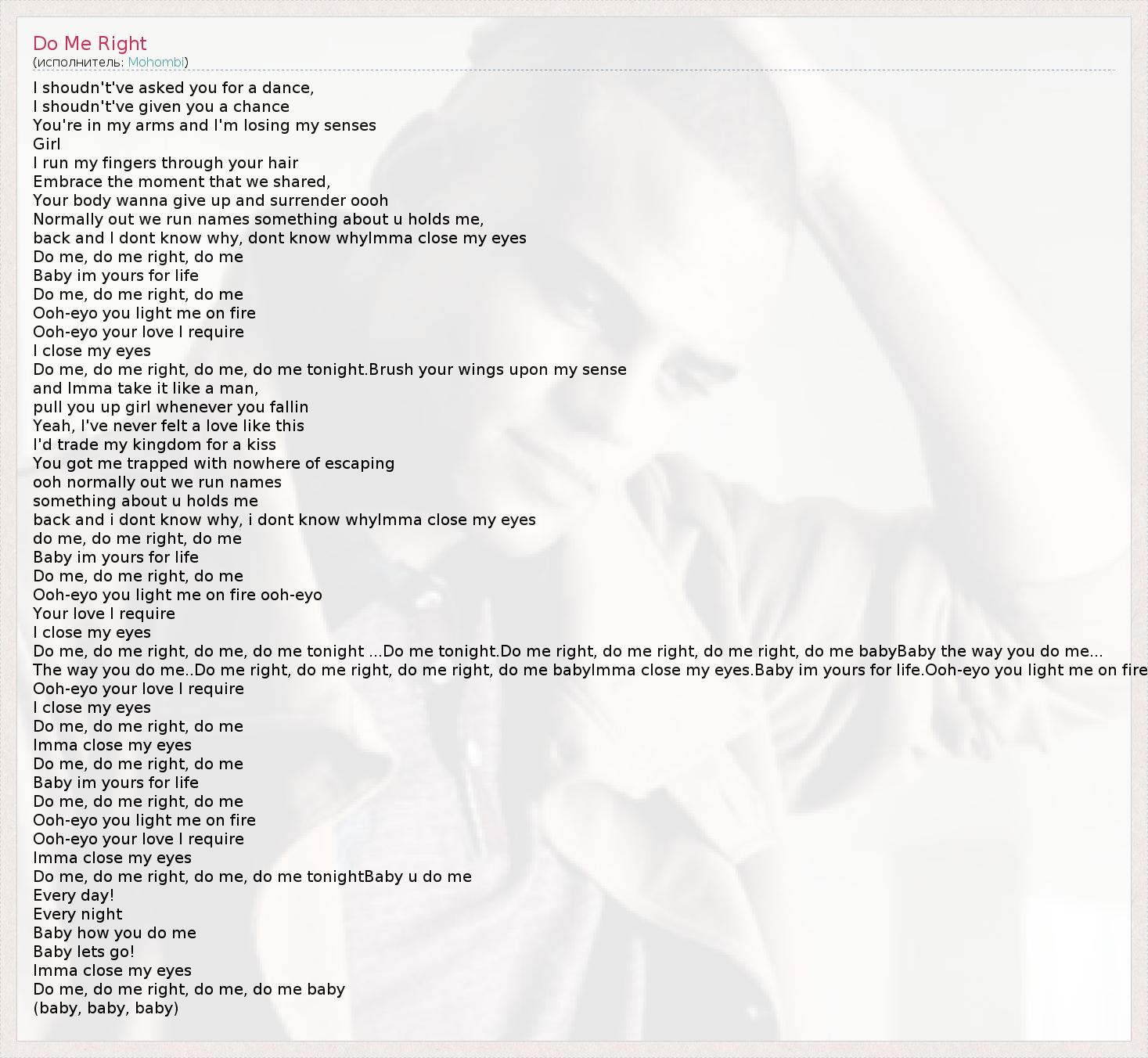 Do me, do me right, do me, do me tonight ...Do me tonight.Do me right, do me right, do me right, do me babyBaby the way you do me...