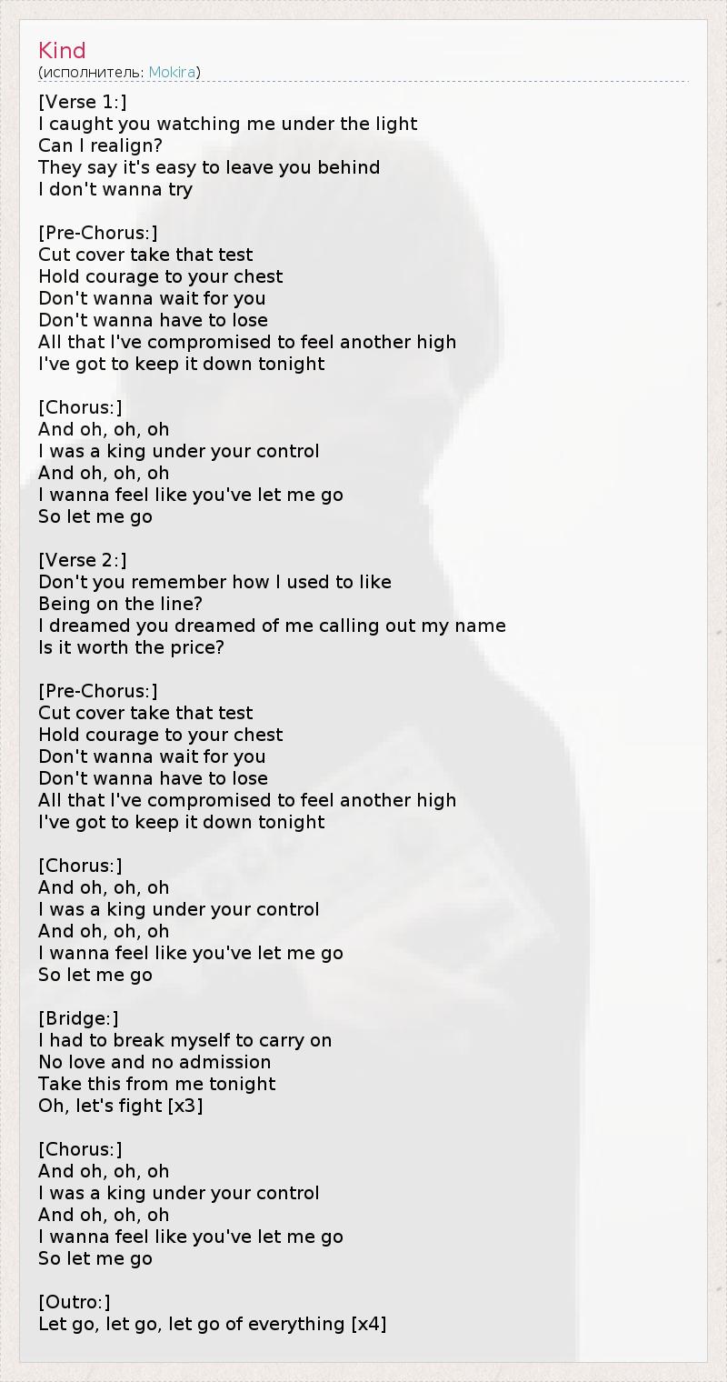 [Verse 1:] I caught you watching me under the light Can I realign? They say it's easy to leave you behind I don't wanna try [Pre-Chorus:] Cut cover take that test Hold courage to your chest Don't wanna wait for you Don't wanna have to lose All that I've compromised to feel another high I've got to keep it down tonight [Chorus:] And oh, oh, oh I was a king under your control And oh, oh, oh I wanna feel like you've let me go So let me go [Verse 2:] Don't you remember how I used to like Being on the line? I dreamed you dreamed of me calling out my name Is it worth the price? [Pre-Chorus:] Cut cover take that test Hold courage to your chest Don't wanna wait for you Don't wanna have to lose All that I've compromised to feel another high I've got to keep it down tonight [Chorus:] And oh, oh, oh I was a king under your control And oh, oh, oh I wanna feel like you've let me go So let me go [Bridge:] I had to break myself to carry on No love and no admission Take this from me tonight Oh, let's fight [x3] [Chorus:] And oh, oh, oh I was a king under your control And oh, oh, oh I wanna feel like you've let me go So let me go [Outro:] Let go, let go, let go of everything [x4]