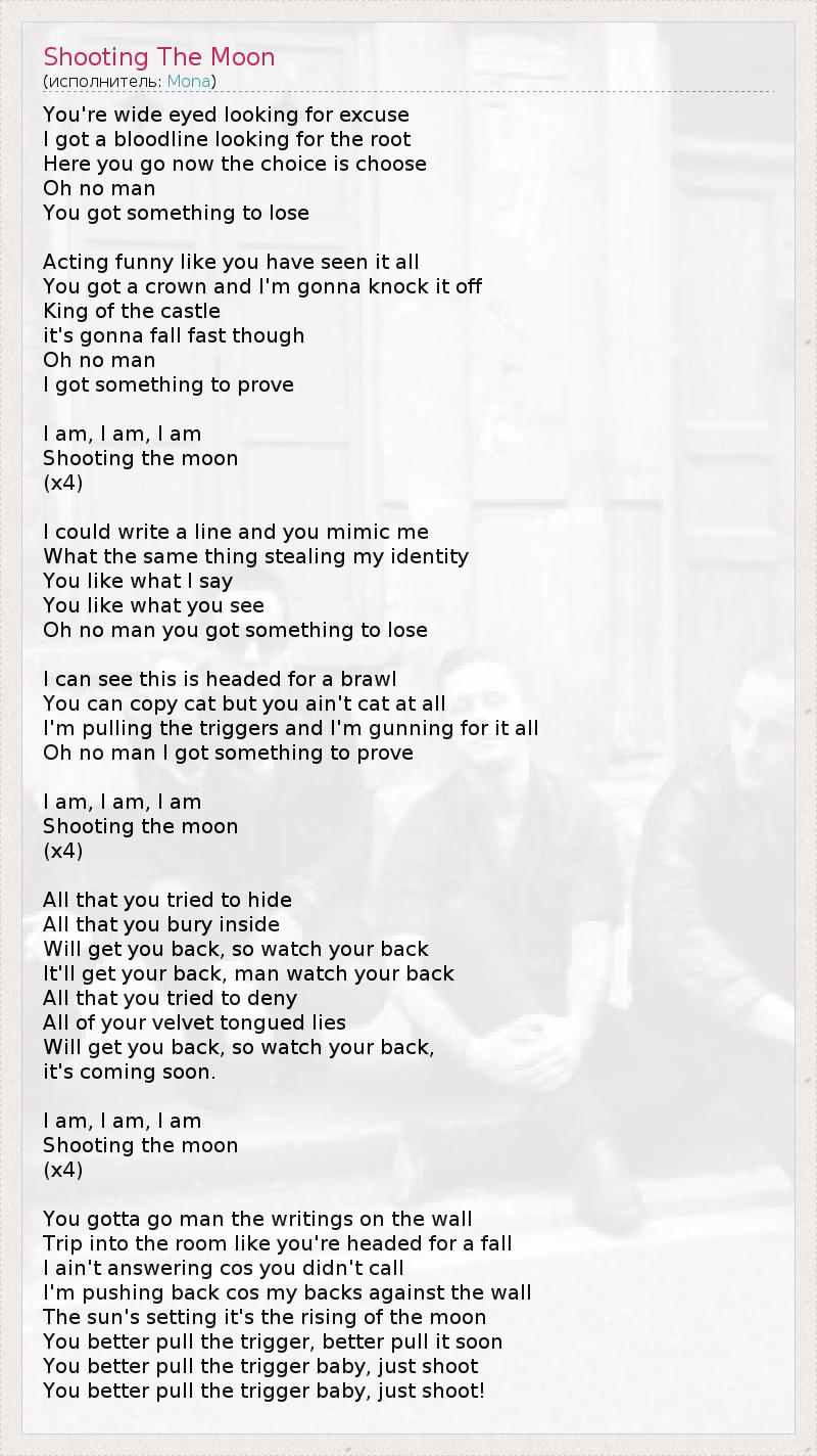 You're wide eyed looking for excuse I got a bloodline looking for the root Here you go now the choice is choose Oh no man You got something to lose Acting funny like you have seen it all You got a crown and I'm gonna knock it off King of the castle it's gonna fall fast though Oh no man I got something to prove I am, I am, I am Shooting the moon (x4) I could write a line and you mimic me What the same thing stealing my identity You like what I say You like what you see Oh no man you got something to lose I can see this is headed for a brawl You can copy cat but you ain't cat at all I'm pulling the triggers and I'm gunning for it all Oh no man I got something to prove I am, I am, I am Shooting the moon (x4) All that you tried to hide All that you bury inside Will get you back, so watch your back It'll get your back, man watch your back All that you tried to deny All of your velvet tongued lies Will get you back, so watch your back, it's coming soon. I am, I am, I am Shooting the moon (x4) You gotta go man the writings on the wall Trip into the room like you're headed for a fall I ain't answering cos you didn't call I'm pushing back cos my backs against the wall The sun's setting it's the rising of the moon You better pull the trigger, better pull it soon You better pull the trigger baby, just shoot You better pull the trigger baby, just shoot!