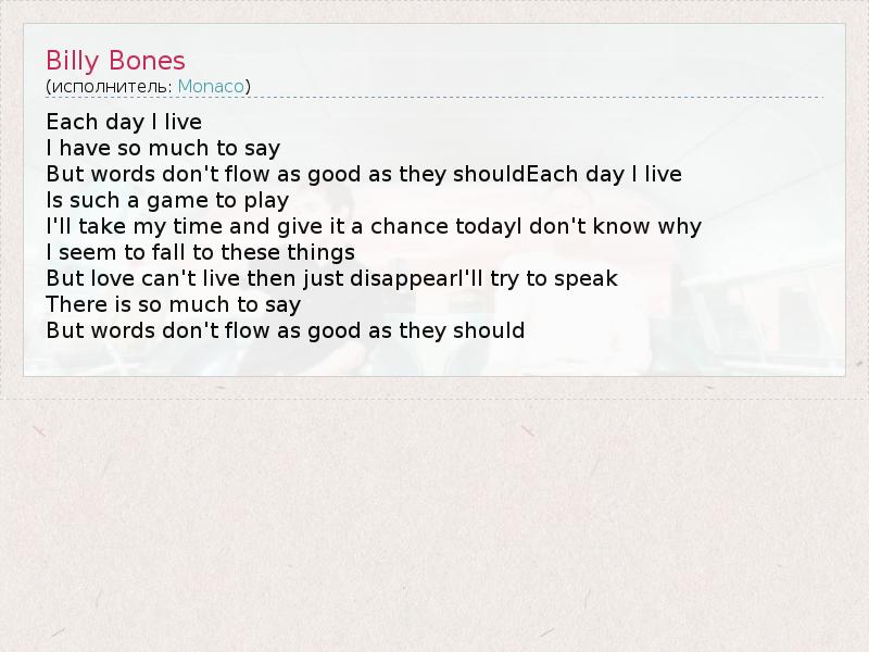 Each day I live I have so much to say But words don't flow as good as they shouldEach day I live Is such a game to play I'll take my time and give it a chance todayI don't know why I seem to fall to these things But love can't live then just disappearI'll try to speak There is so much to say But words don't flow as good as they should