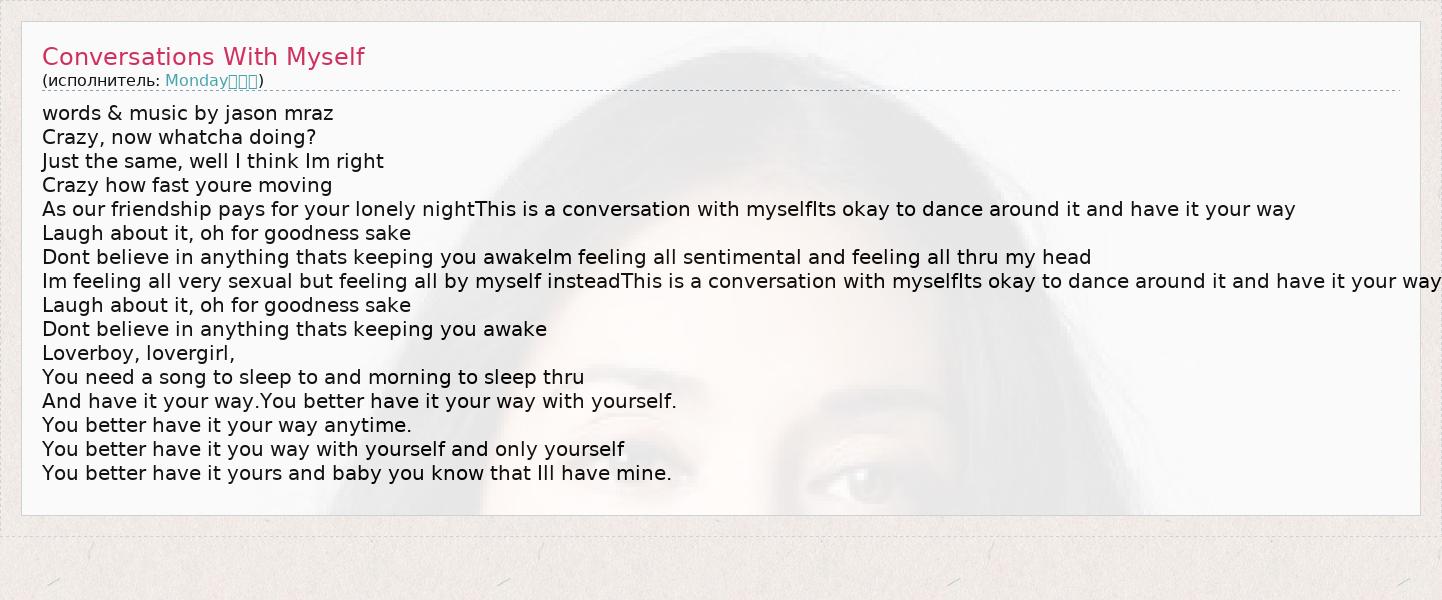 words & music by jason mraz Crazy, now whatcha doing? Just the same, well I think Im right Crazy how fast youre moving As our friendship pays for your lonely nightThis is a conversation with myselfIts okay to dance around it and have it your way Laugh about it, oh for goodness sake Dont believe in anything thats keeping you awakeIm feeling all sentimental and feeling all thru my head Im feeling all very sexual but feeling all by myself insteadThis is a conversation with myselfIts okay to dance around it and have it your way Laugh about it, oh for goodness sake Dont believe in anything thats keeping you awake Loverboy, lovergirl, You need a song to sleep to and morning to sleep thru And have it your way.You better have it your way with yourself. You better have it your way anytime. You better have it you way with yourself and only yourself You better have it yours and baby you know that Ill have mine.