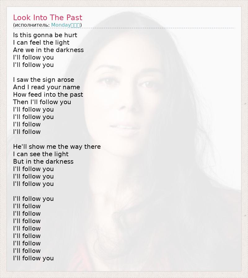 В прошлое Это будет больно? Я ощущаю этот свет. Мы во тьме? Я последую за тобой, Я последую за тобой. Я увидела, как появился знак, И я прочла твоё имя. Как попасть в прошлое? Тогда я последую за тобой, Я последую за тобой, Я последую за тобой, Я последую, Я последую. Он мне покажет дорогу туда, Я ощущаю этот свет. Но во тьме Я последую за тобой, Я последую за тобой, Я последую за тобой. Я последую за тобой, Я последую, Я последую, Я последую, Я последую, Я последую, Я последую, Я последую, Я последую за тобой