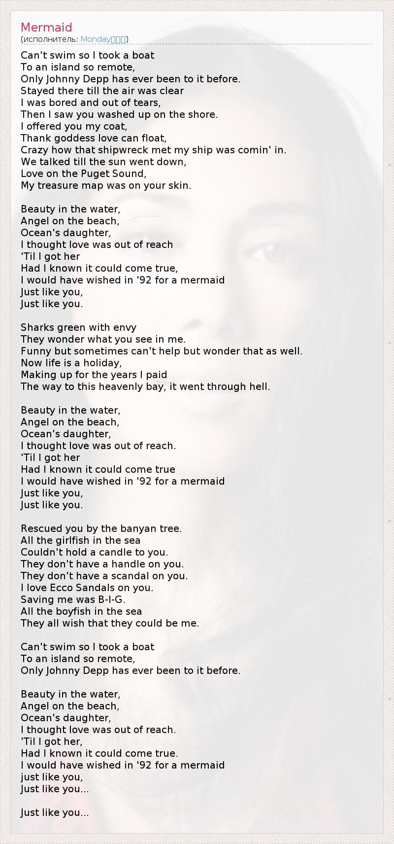 Не умею плавать, поэтому я взял лодку, Чтобы доплыть до далекого острова, Где прежде бывал только Джонни Депп. Воздух стал чистым, а я все был там, Заскучал и уже не мог плакать. Тогда-то я и увидел, как ты вышла на берег. Предложил тебе пальто, Слава Богу, богиня Любви умела плавать. C ума сойти, как кстати было это кораблекрушение! Мы проговорили до заката, На Пьюджет-Саунд царила любовь... Моя карта сокровищ была на твоей коже. Красавица в воде, Ангел на берегу, Дочь океана, Я думал, мне не найти любовь, Пока не обрел ее. Знал ли я, что все сбудется.. Вот бы было встретить в 92-ом такую русалку, Как ты, Как ты. Акулы зеленели от зависти, Они недоумевали, что ты во мне нашла. Забавно, но порой я и сам не могу этому не удивляться. Жизнь стала праздником, Вознаграждением за все, что я пережил. Путь к этому райскому заливу прошел через ад... Красавица в воде, Ангел на берегу, Дочь океана, Я думал, мне не найти любовь, Пока не обрел ее. Знал ли я, что все сбудется.. Вот бы было встретить в 92-ом такую русалку, Как ты, Как ты. Я спас тебя от баньяна. Все русалки океана Тебе и в подметки не годятся, Они и рядом с тобой не стояли, Они даже не могут устроить из-за тебя скандал. Я люблю, когда ты носишь босоножки ECCO. Мое спасение - это так здорово, Все парни-русалки Мечтали бы оказаться на моем месте. Не умею плавать, поэтому я взял лодку, Чтобы доплыть до далекого острова, Где прежде бывал только Джонни Депп. Красавица в воде, Ангел на берегу, Дочь океана, Я думал, мне не найти любовь, Пока не обрел ее. Знал ли я, что все сбудется.. Вот бы было встретить в 92-ом такую русалку, Как ты, Как ты... Как ты...