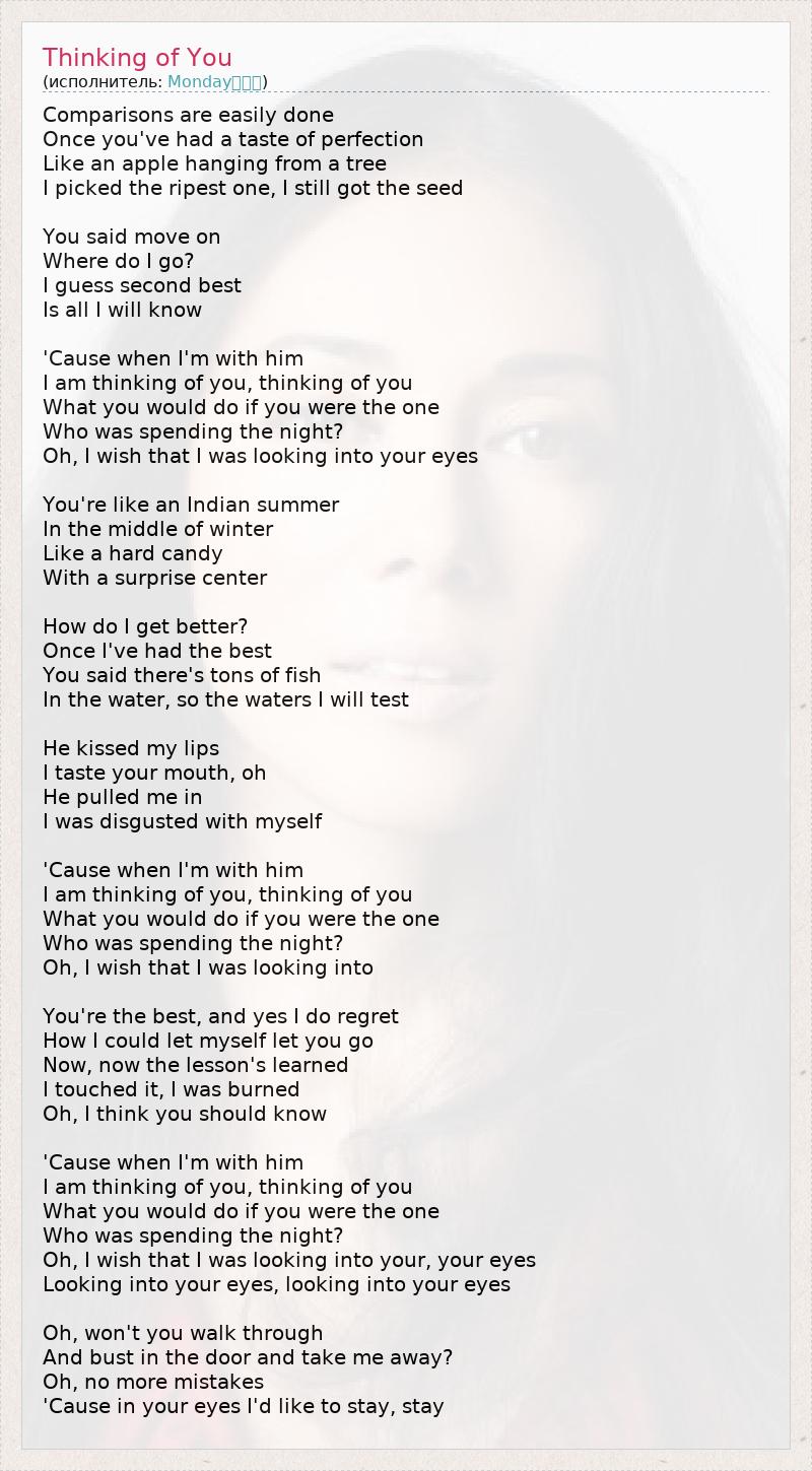 Легко делать сравнения, Однажды почувствовав вкус совершенства. Среди яблок, висящих на ветке, Я выбрала самое спелое И до сих пор храню зернышко Ты сказал: Иди дальше, А куда идти? Видимо, с мужчинами второго сорта - Вот, с кем мне придётся иметь дело. Потому что когда я с ним, Я думаю о тебе Думаю о тебе. Что бы ты сделал, если бы Я проводила с тобой ночь? Как бы я хотела Смотреть в твои глаза!.. Ты как бабье лето Посреди зимы, Как леденец на палочке С неожиданной начинкой. Как же мне станет лучше, Если я потеряла лучшего мужчину? Ты сказал, что В воде полно разных рыбёшек, Ну, что ж - с этого дня я в поиске. Он поцеловал мои губы - А я почувствовала вкус твоих. Он притянул меня к себе - Я самой себе стала противна. Потому что когда я с ним, Я думаю о тебе, Думаю о тебе. Что бы ты сделал, если бы Я проводила с тобой ночь? Как бы я хотела Смотреть в твои... Ты лучший. И да, я сожалею, Как я позволила себе Отпустить тебя? Теперь я выучила урок, Я дотронулась до пламени и обожглась. Я думаю, ты должен знать... Что когда я с ним, Я думаю о тебе, Думаю о тебе . Что бы ты сделал, если бы Я проводила с тобой ночь? Как бы я хотела Смотреть в твои глаза Смотреть в твои глаза... Смотреть в твои глаза... Почему ты не прийдешь, Не ворвешься в эту дверь, Не заберешь меня... Больше никаких ошибок Потому что в твоих глазах я хочу остаться...