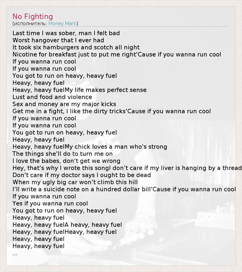 Last time I was sober, man I felt bad Worst hangover that I ever had It took six hamburgers and scotch all night Nicotine for breakfast just to put me right'Cause if you wanna run cool If you wanna run cool If you wanna run cool You got to run on heavy, heavy fuel Heavy, heavy fuel Heavy, heavy fuelMy life makes perfect sense Lust and food and violence Sex and money are my major kicks Get me in a fight, I like the dirty tricks'Cause if you wanna run cool If you wanna run cool If you wanna run cool You got to run on heavy, heavy fuel Heavy, heavy fuel Heavy, heavy fuelMy chick loves a man who's strong The things she'll do to turn me on I love the babes, don't get we wrong Hey, that's why I wrote this songI don't care if my liver is hanging by a thread Don't care if my doctor says I ought to be dead When my ugly big car won't climb this hill I'll write a suicide note on a hundred dollar bill'Cause if you wanna run cool If you wanna run cool Yes if you wanna run cool You got to run on heavy, heavy fuel Heavy, heavy fuel Heavy, heavy fuelA heavy, heavy fuel Heavy, heavy fuelHeavy, heavy fuel Heavy, heavy fuel Heavy, heavy fuel ...
