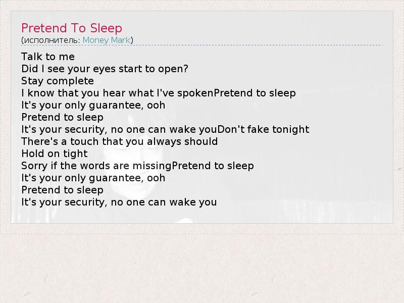 Talk to me Did I see your eyes start to open? Stay complete I know that you hear what I've spokenPretend to sleep It's your only guarantee, ooh Pretend to sleep It's your security, no one can wake youDon't fake tonight There's a touch that you always should Hold on tight Sorry if the words are missingPretend to sleep It's your only guarantee, ooh Pretend to sleep It's your security, no one can wake you