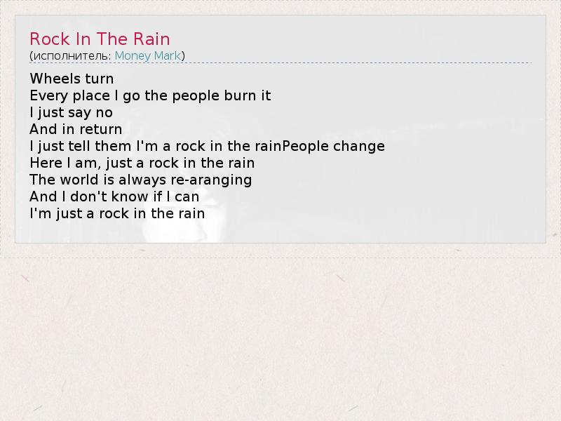 Wheels turn Every place I go the people burn it I just say no And in return I just tell them I'm a rock in the rainPeople change Here I am, just a rock in the rain The world is always re-aranging And I don't know if I can I'm just a rock in the rain