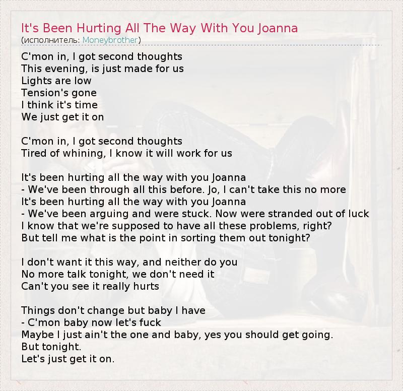 А как ты думаешь, о чем песня "It's Been Hurting All The Way With You Joanna" ?
