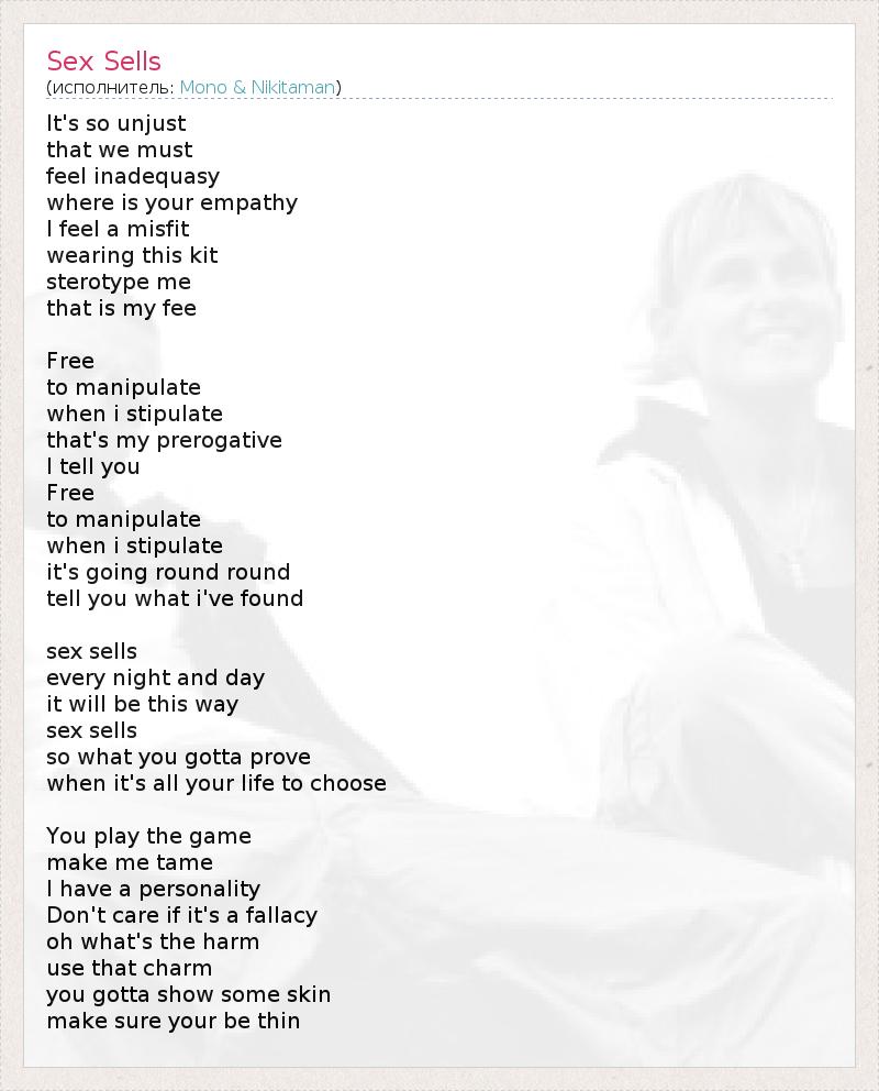 It's so unjust that we must feel inadequasy where is your empathy I feel a misfit wearing this kit sterotype me that is my fee Free to manipulate when i stipulate that's my prerogative I tell you Free to manipulate when i stipulate it's going round round tell you what i've found sex sells every night and day it will be this way sex sells so what you gotta prove when it's all your life to choose You play the game make me tame I have a personality Don't care if it's a fallacy oh what's the harm use that charm you gotta show some skin make sure your be thin