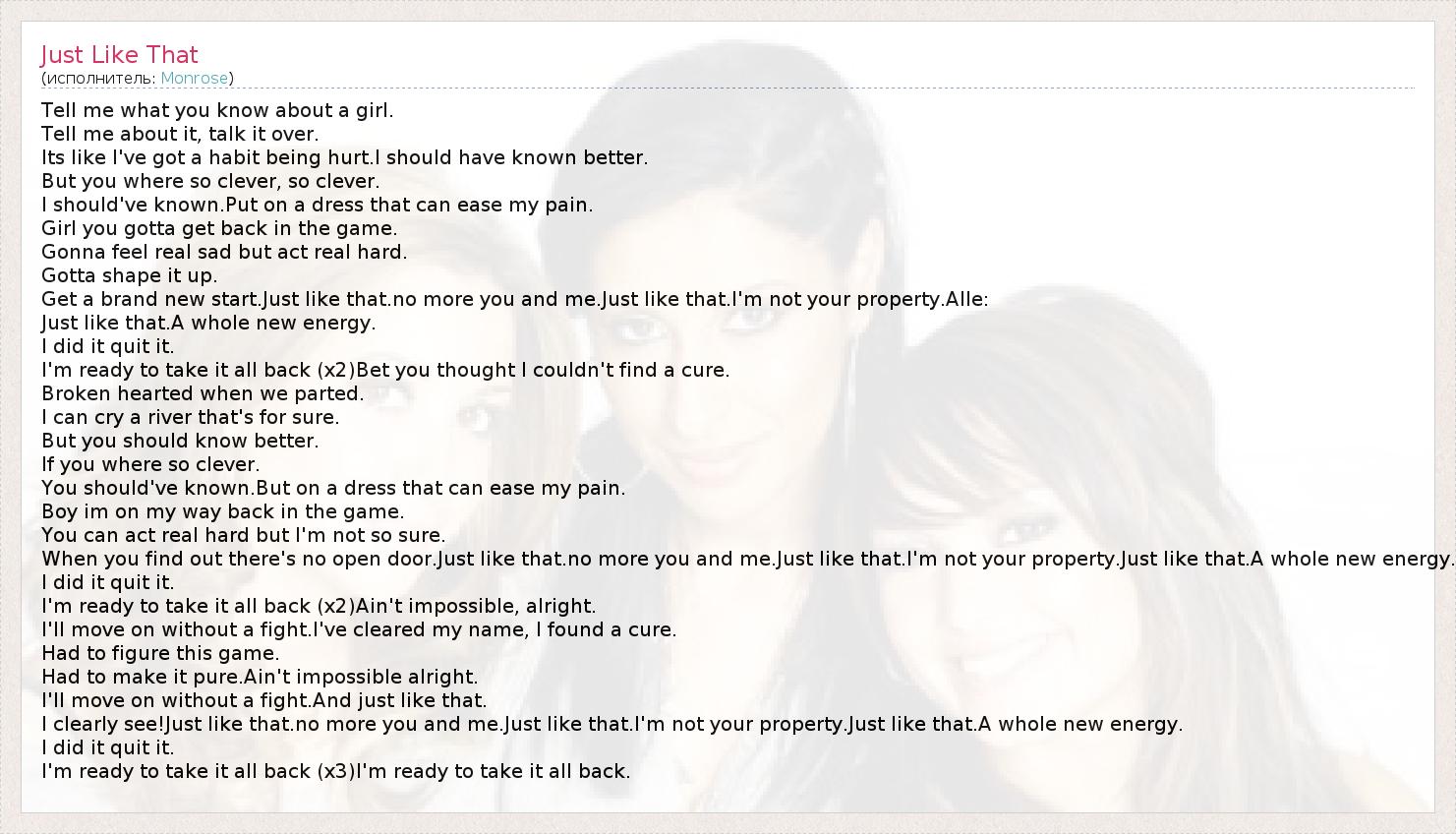 When you find out there's no open door.Just like that.no more you and me.Just like that.I'm not your property.Just like that.A whole new energy.