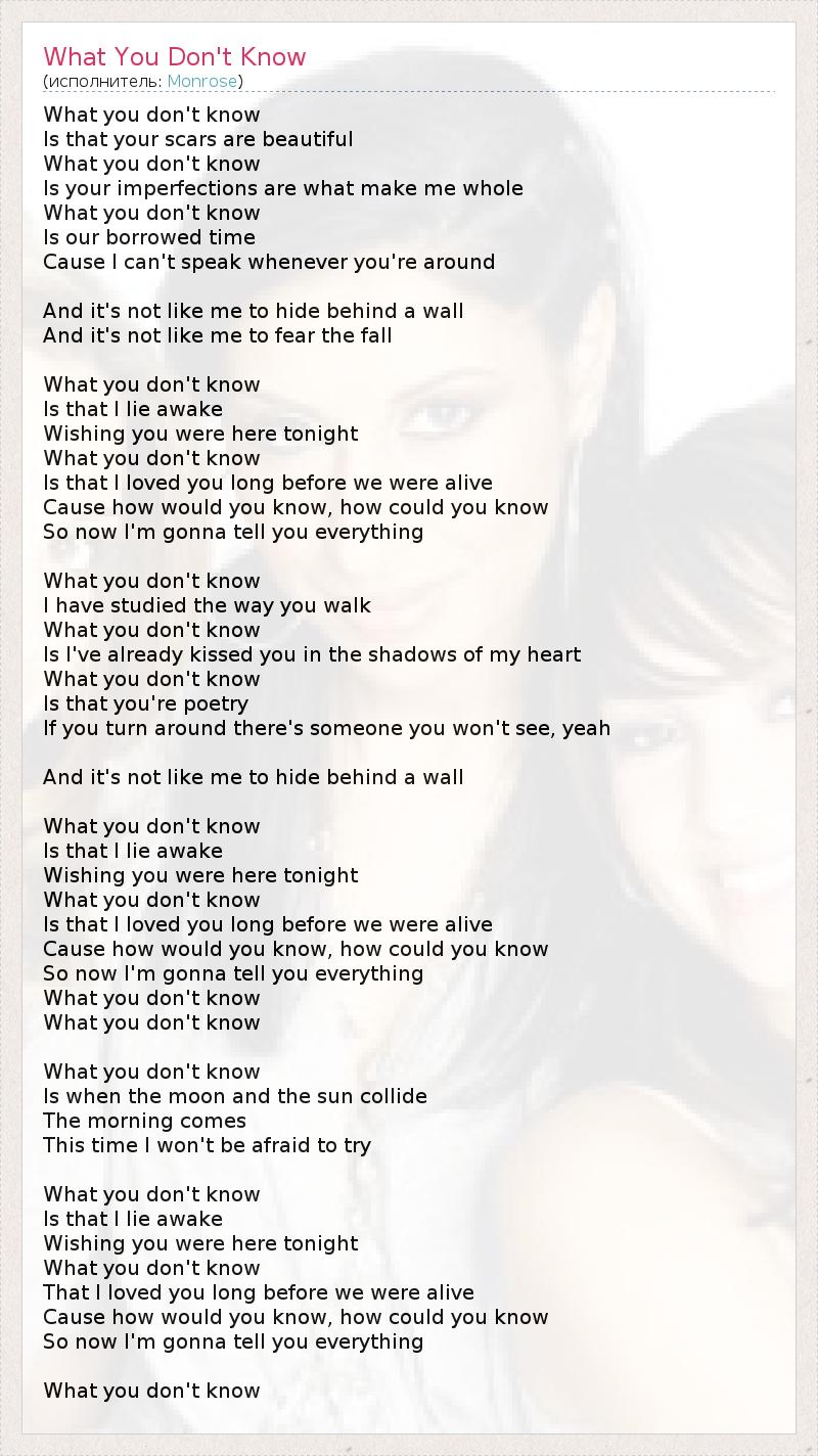 What you don't know Is that your scars are beautiful What you don't know Is your imperfections are what make me whole What you don't know Is our borrowed time Cause I can't speak whenever you're around And it's not like me to hide behind a wall And it's not like me to fear the fall What you don't know Is that I lie awake Wishing you were here tonight What you don't know Is that I loved you long before we were alive Cause how would you know, how could you know So now I'm gonna tell you everything What you don't know I have studied the way you walk What you don't know Is I've already kissed you in the shadows of my heart What you don't know Is that you're poetry If you turn around there's someone you won't see, yeah And it's not like me to hide behind a wall What you don't know Is that I lie awake Wishing you were here tonight What you don't know Is that I loved you long before we were alive Cause how would you know, how could you know So now I'm gonna tell you everything What you don't know What you don't know What you don't know Is when the moon and the sun collide The morning comes This time I won't be afraid to try What you don't know Is that I lie awake Wishing you were here tonight What you don't know That I loved you long before we were alive Cause how would you know, how could you know So now I'm gonna tell you everything What you don't know