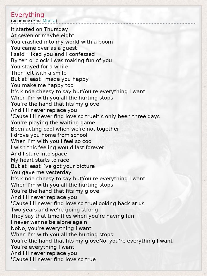 It started on Thursday At seven or maybe eight You crashed into my world with a boom You came over as a guest I said I liked you and I confessed By ten o' clock I was making fun of you You stayed for a while Then left with a smile But at least I made you happy You make me happy too It's kinda cheesy to say butYou're everything I want When I'm with you all the hurting stops You're the hand that fits my glove And I'll never replace you 'Cause I'll never find love so trueIt's only been three days You're playing the waiting game Been acting cool when we're not together I drove you home from school When I'm with you I feel so cool I wish this feeling would last forever And I stare into space My heart starts to race But at least I've got your picture You gave me yesterday It's kinda cheesy to say butYou're everything I want When I'm with you all the hurting stops You're the hand that fits my glove And I'll never replace you 'Cause I'll never find love so trueLooking back at us Two years and we're going strong They say that time flies when you're having fun I never wanna be alone again NoNo, you're everything I want When I'm with you all the hurting stops You're the hand that fits my gloveNo, you're everything I want You're everything I want And I'll never replace you 'Cause I'll never find love so true