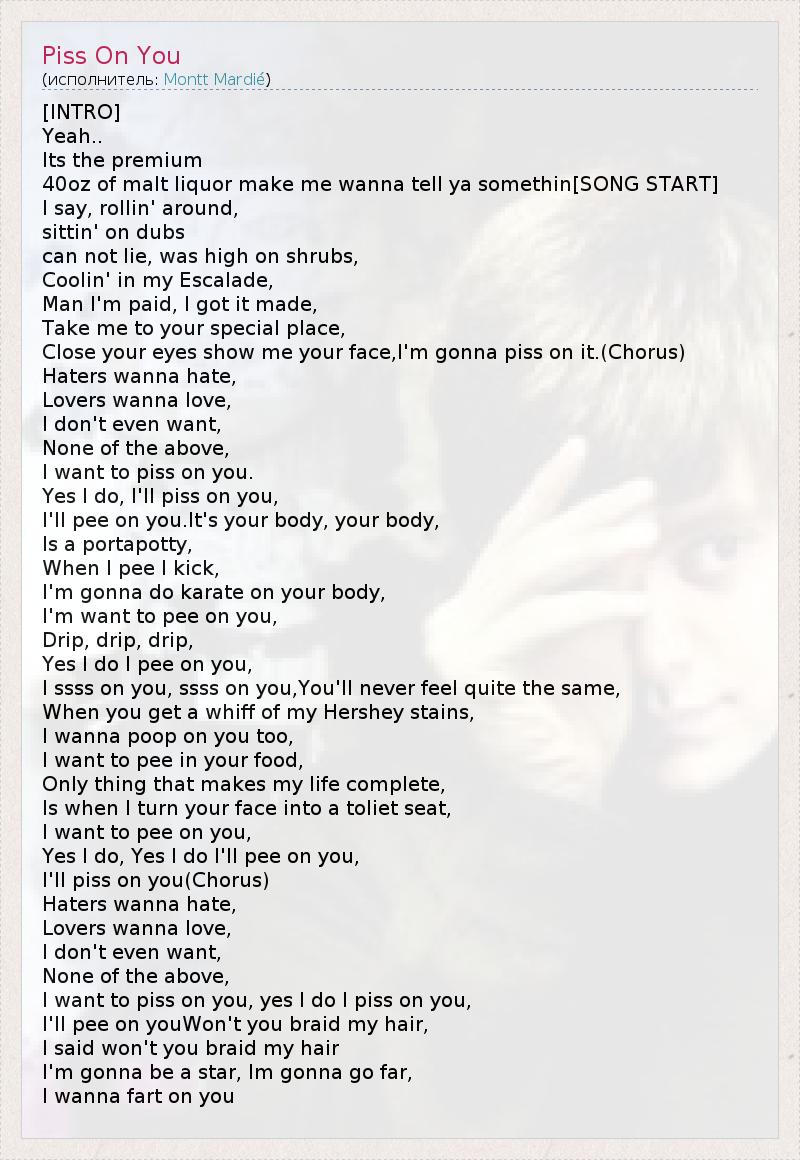 [INTRO] Yeah.. Its the premium 40oz of malt liquor make me wanna tell ya somethin[SONG START] I say, rollin' around, sittin' on dubs can not lie, was high on shrubs, Coolin' in my Escalade, Man I'm paid, I got it made, Take me to your special place, Close your eyes show me your face,I'm gonna piss on it.(Chorus) Haters wanna hate, Lovers wanna love, I don't even want, None of the above, I want to piss on you. Yes I do, I'll piss on you, I'll pee on you.It's your body, your body, Is a portapotty, When I pee I kick, I'm gonna do karate on your body, I'm want to pee on you, Drip, drip, drip, Yes I do I pee on you, I ssss on you, ssss on you,You'll never feel quite the same, When you get a whiff of my Hershey stains, I wanna poop on you too, I want to pee in your food, Only thing that makes my life complete, Is when I turn your face into a toliet seat, I want to pee on you, Yes I do, Yes I do I'll pee on you, I'll piss on you(Chorus) Haters wanna hate, Lovers wanna love, I don't even want, None of the above, I want to piss on you, yes I do I piss on you, I'll pee on youWon't you braid my hair, I said won't you braid my hair I'm gonna be a star, Im gonna go far, I wanna fart on you