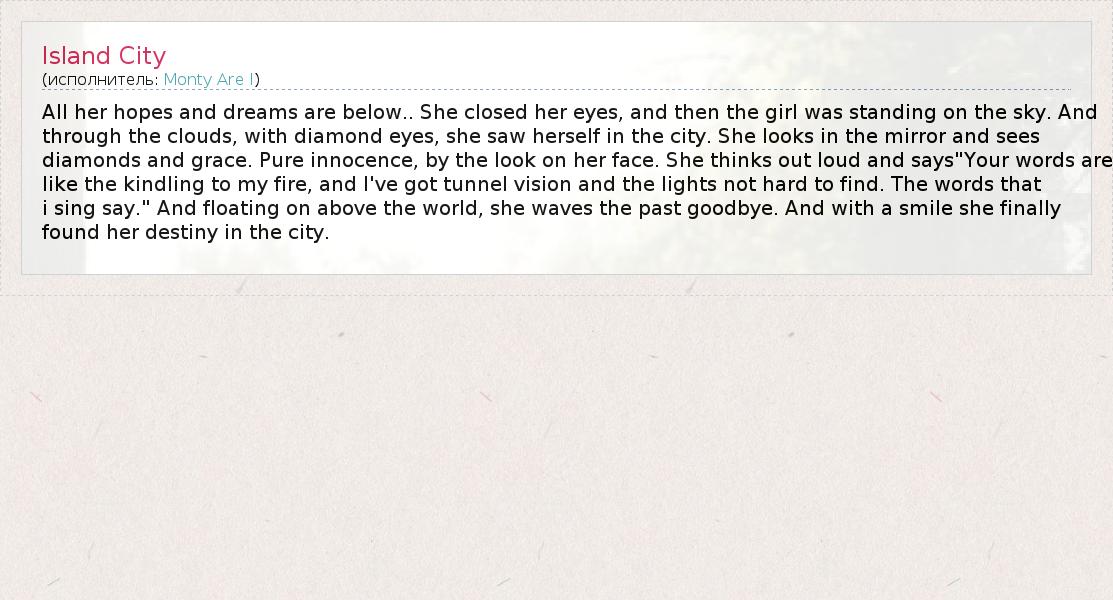 All her hopes and dreams are below.. She closed her eyes, and then the girl was standing on the sky. And through the clouds, with diamond eyes, she saw herself in the city. She looks in the mirror and sees diamonds and grace. Pure innocence, by the look on her face. She thinks out loud and says"Your words are like the kindling to my fire, and I've got tunnel vision and the lights not hard to find. The words that i sing say." And floating on above the world, she waves the past goodbye. And with a smile she finally found her destiny in the city.