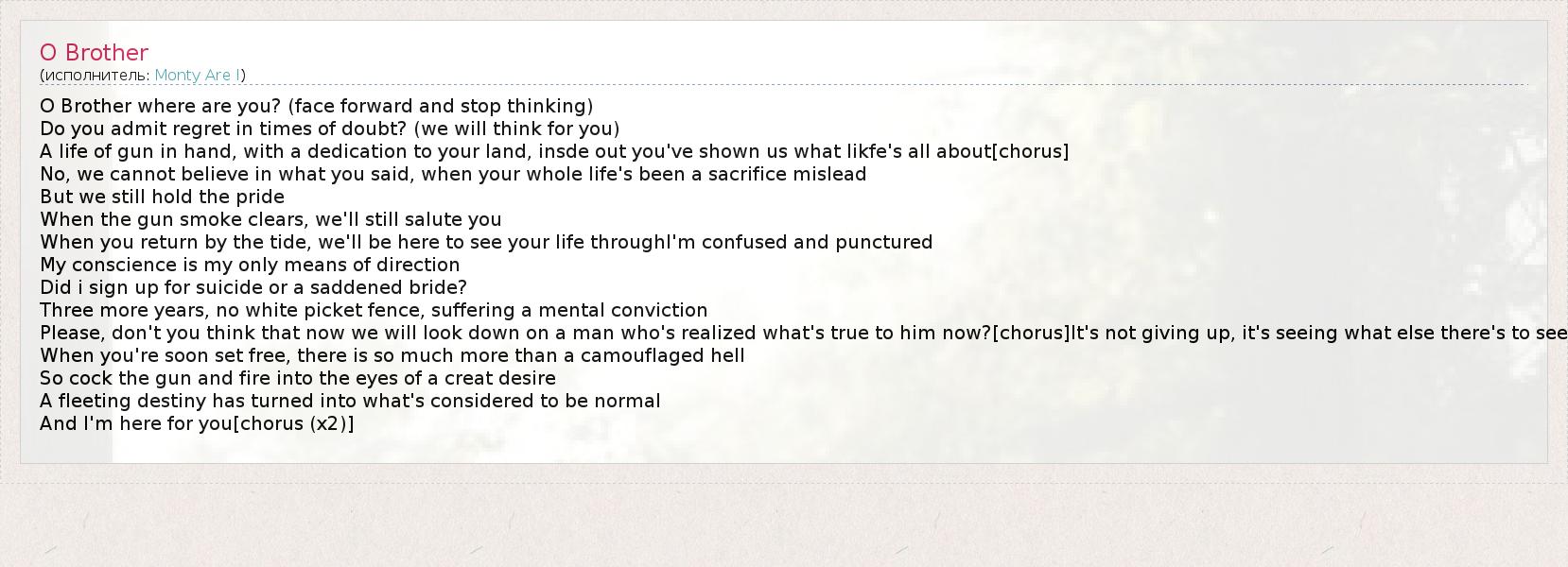 Это интересно:Monty Are I (ранее известный как Monty's Fan Club и Monty) американская альтернативная рок-группа Крэнстон, Род-Айленд. Монти недавно выиграл конкурс Takeover Records 'My Band на MySpace, в итоге подписал договор с Stolen Transmission и был переправлен к Island Records. Они также выиграли Ernie Ball авторами Battle of the Bands в 2003 году.Monty проводили множество национальных туров, как самостоятельно, так и с Just Surrender, Secondhand Serenade, Amber Pacific, Anberlin,... продолжение
