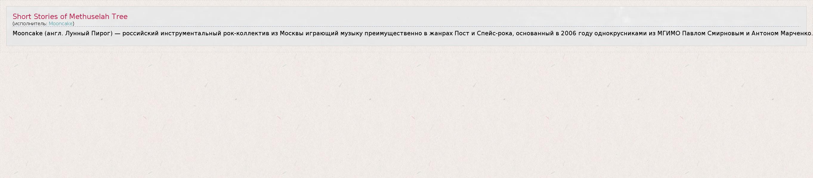 Это интересно:Официальный сайт: http://mooncake.ru/Mooncake (рус. Лунный Пирог) — российский оркестр. Является одним из лидеров инструментальной сцены России, коллектив создал свой собственный стиль и звучание на стыке различных инструментальных жанров (арт- и спейс-рока, неоклассики, джаз-фьюжна и других). Музыка Mooncake отличается симфоническим звучанием и эмоциональными перепадами... продолжение