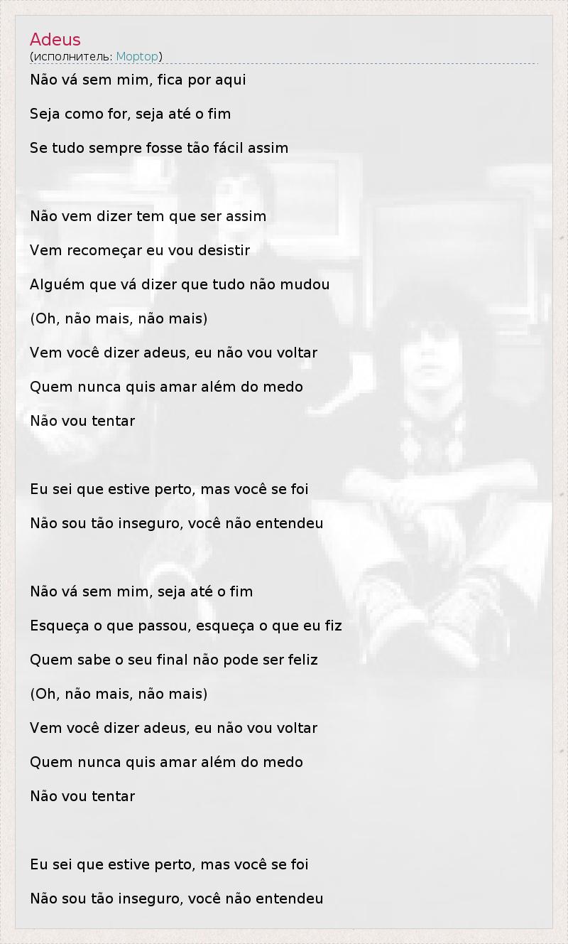 Não vá sem mim, fica por aqui Seja como for, seja até o fim Se tudo sempre fosse tão fácil assim Não vem dizer tem que ser assim Vem recomeçar eu vou desistir Alguém que vá dizer que tudo não mudou (Oh, não mais, não mais) Vem você dizer adeus, eu não vou voltar Quem nunca quis amar além do medo Não vou tentar Eu sei que estive perto, mas você se foi Não sou tão inseguro, você não entendeu Não vá sem mim, seja até o fim Esqueça o que passou, esqueça o que eu fiz Quem sabe o seu final não pode ser feliz (Oh, não mais, não mais) Vem você dizer adeus, eu não vou voltar Quem nunca quis amar além do medo Não vou tentar Eu sei que estive perto, mas você se foi Não sou tão inseguro, você não entendeu