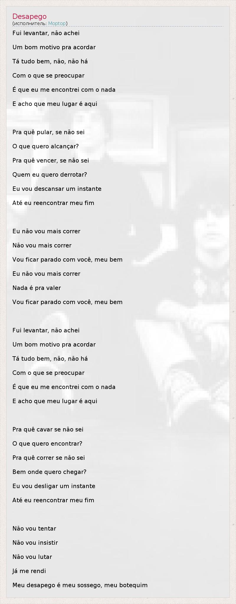 Fui levantar, não achei Um bom motivo pra acordar Tá tudo bem, não, não há Com o que se preocupar É que eu me encontrei com o nada E acho que meu lugar é aqui Pra quê pular, se não sei O que quero alcançar? Pra quê vencer, se não sei Quem eu quero derrotar? Eu vou descansar um instante Até eu reencontrar meu fim Eu não vou mais correr Não vou mais correr Vou ficar parado com você, meu bem Eu não vou mais correr Nada é pra valer Vou ficar parado com você, meu bem Fui levantar, não achei Um bom motivo pra acordar Tá tudo bem, não, não há Com o que se preocupar É que eu me encontrei com o nada E acho que meu lugar é aqui Pra quê cavar se não sei O que quero encontrar? Pra quê correr se não sei Bem onde quero chegar? Eu vou desligar um instante Até eu reencontrar meu fim Não vou tentar Não vou insistir Não vou lutar Já me rendi Meu desapego é meu sossego, meu botequim