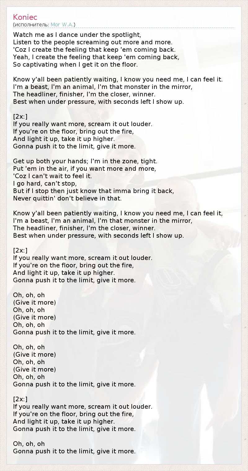 Watch me as I dance under the spotlight, Listen to the people screaming out more and more. 'Coz I create the feeling that keep 'em coming back. Yeah, I create the feeling that keep 'em coming back, So captivating when I get it on the floor. Know y'all been patiently waiting, I know you need me, I can feel it. I'm a beast, I'm an animal, I'm that monster in the mirror, The headliner, finisher, I'm the closer, winner. Best when under pressure, with seconds left I show up. [2x:] If you really want more, scream it out louder. If you're on the floor, bring out the fire, And light it up, take it up higher. Gonna push it to the limit, give it more. Get up both your hands; I'm in the zone, tight. Put 'em in the air, if you want more and more, 'Coz I can't wait to feel it. I go hard, can't stop, But if I stop then just know that imma bring it back, Never quittin' don't believe in that. Know y'all been patiently waiting, I know you need me, I can feel it, I'm a beast, I'm an animal, I'm that monster in the mirror, The headliner, finisher, I'm the closer, winner. Best when under pressure, with seconds left I show up. [2x:] If you really want more, scream it out louder. If you're on the floor, bring out the fire, And light it up, take it up higher. Gonna push it to the limit, give it more. Oh, oh, oh (Give it more) Oh, oh, oh (Give it more) Oh, oh, oh Gonna push it to the limit, give it more. Oh, oh, oh (Give it more) Oh, oh, oh (Give it more) Oh, oh, oh Gonna push it to the limit, give it more. [2x:] If you really want more, scream it out louder. If you're on the floor, bring out the fire, And light it up, take it up higher. Gonna push it to the limit, give it more. Oh, oh, oh Gonna push it to the limit, give it more.