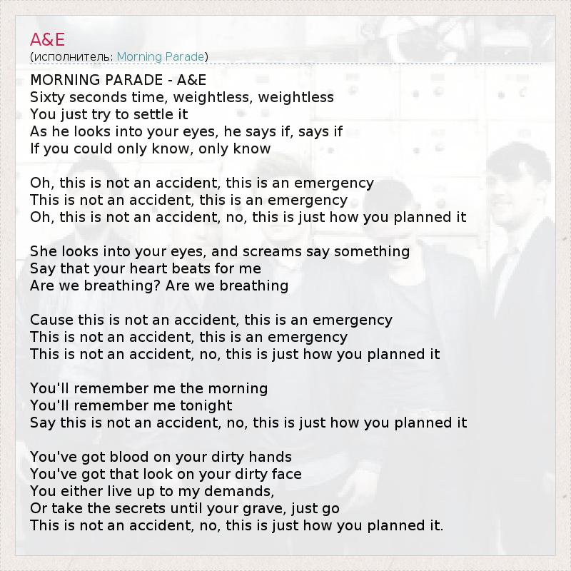 MORNING PARADE - A&E Sixty seconds time, weightless, weightless You just try to settle it As he looks into your eyes, he says if, says if If you could only know, only know Oh, this is not an accident, this is an emergency This is not an accident, this is an emergency Oh, this is not an accident, no, this is just how you planned it She looks into your eyes, and screams say something Say that your heart beats for me Are we breathing? Are we breathing Cause this is not an accident, this is an emergency This is not an accident, this is an emergency This is not an accident, no, this is just how you planned it You'll remember me the morning You'll remember me tonight Say this is not an accident, no, this is just how you planned it You've got blood on your dirty hands You've got that look on your dirty face You either live up to my demands, Or take the secrets until your grave, just go This is not an accident, no, this is just how you planned it.