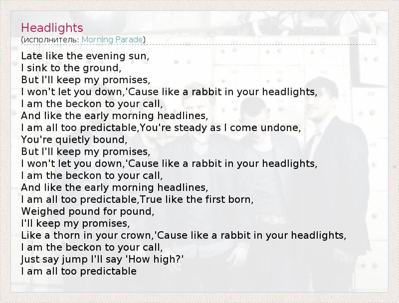 Late like the evening sun, I sink to the ground, But I'll keep my promises, I won't let you down,'Cause like a rabbit in your headlights, I am the beckon to your call, And like the early morning headlines, I am all too predictable,You're steady as I come undone, You're quietly bound, But I'll keep my promises, I won't let you down,'Cause like a rabbit in your headlights, I am the beckon to your call, And like the early morning headlines, I am all too predictable,True like the first born, Weighed pound for pound, I'll keep my promises, Like a thorn in your crown,'Cause like a rabbit in your headlights, I am the beckon to your call, Just say jump I'll say 'How high?' I am all too predictable