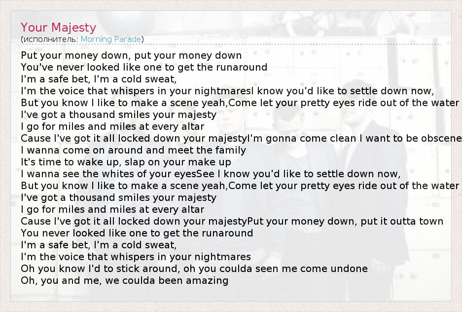 Put your money down, put your money down You've never looked like one to get the runaround I'm a safe bet, I'm a cold sweat, I'm the voice that whispers in your nightmaresI know you'd like to settle down now, But you know I like to make a scene yeah,Come let your pretty eyes ride out of the water I've got a thousand smiles your majesty I go for miles and miles at every altar Cause I've got it all locked down your majestyI'm gonna come clean I want to be obscene I wanna come on around and meet the family It's time to wake up, slap on your make up I wanna see the whites of your eyesSee I know you'd like to settle down now, But you know I like to make a scene yeah,Come let your pretty eyes ride out of the water I've got a thousand smiles your majesty I go for miles and miles at every altar Cause I've got it all locked down your majestyPut your money down, put it outta town You never looked like one to get the runaround I'm a safe bet, I'm a cold sweat, I'm the voice that whispers in your nightmares Oh you know I'd to stick around, oh you coulda seen me come undone Oh, you and me, we coulda been amazing