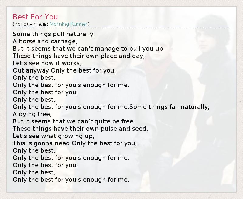 Some things pull naturally, A horse and carriage, But it seems that we can't manage to pull you up. These things have their own place and day, Let's see how it works, Out anyway.Only the best for you, Only the best, Only the best for you's enough for me. Only the best for you, Only the best, Only the best for you's enough for me.Some things fall naturally, A dying tree, But it seems that we can't quite be free. These things have their own pulse and seed, Let's see what growing up, This is gonna need.Only the best for you, Only the best, Only the best for you's enough for me. Only the best for you, Only the best, Only the best for you's enough for me.