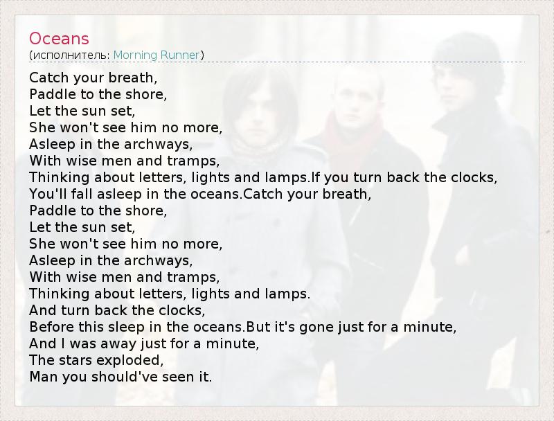 Catch your breath, Paddle to the shore, Let the sun set, She won't see him no more, Asleep in the archways, With wise men and tramps, Thinking about letters, lights and lamps.If you turn back the clocks, You'll fall asleep in the oceans.Catch your breath, Paddle to the shore, Let the sun set, She won't see him no more, Asleep in the archways, With wise men and tramps, Thinking about letters, lights and lamps. And turn back the clocks, Before this sleep in the oceans.But it's gone just for a minute, And I was away just for a minute, The stars exploded, Man you should've seen it.