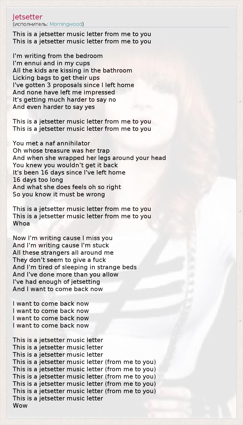This is a jetsetter music letter from me to you This is a jetsetter music letter from me to you I'm writing from the bedroom I'm ennui and in my cups All the kids are kissing in the bathroom Licking bags to get their ups I've gotten 3 proposals since I left home And none have left me impressed It's getting much harder to say no And even harder to say yes This is a jetsetter music letter from me to you This is a jetsetter music letter from me to you You met a naf annihilator Oh whose treasure was her trap And when she wrapped her legs around your head You knew you wouldn't get it back It's been 16 days since I've left home 16 days too long And what she does feels oh so right So you know it must be wrong This is a jetsetter music letter from me to you This is a jetsetter music letter from me to you Whoa Now I'm writing cause I miss you And I'm writing cause I'm stuck All these strangers all around me They don't seem to give a fuck And I'm tired of sleeping in strange beds And I've done more than you allow I've had enough of jetsetting And I want to come back now I want to come back now I want to come back now I want to come back now I want to come back now This is a jetsetter music letter This is a jetsetter music letter This is a jetsetter music letter This is a jetsetter music letter (from me to you) This is a jetsetter music letter (from me to you) This is a jetsetter music letter (from me to you) This is a jetsetter music letter (from me to you) This is a jetsetter music letter (from me to you) This is a jetsetter music letter Wow