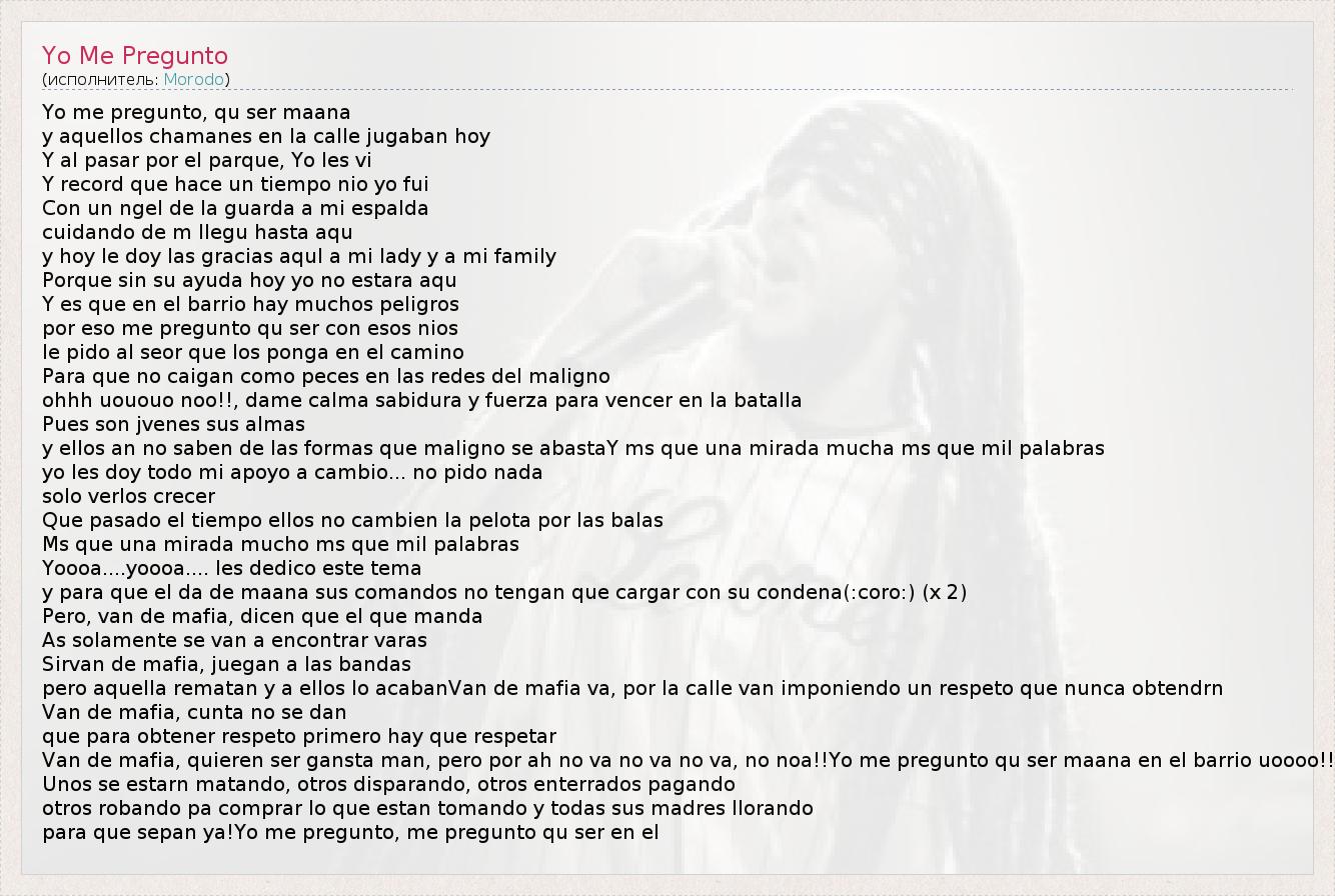 Yo me pregunto, qu ser maana y aquellos chamanes en la calle jugaban hoy Y al pasar por el parque, Yo les vi Y record que hace un tiempo nio yo fui Con un ngel de la guarda a mi espalda cuidando de m llegu hasta aqu y hoy le doy las gracias aqul a mi lady y a mi family Porque sin su ayuda hoy yo no estara aqu Y es que en el barrio hay muchos peligros por eso me pregunto qu ser con esos nios le pido al seor que los ponga en el camino Para que no caigan como peces en las redes del maligno ohhh uououo noo!!, dame calma sabidura y fuerza para vencer en la batalla Pues son jvenes sus almas y ellos an no saben de las formas que maligno se abastaY ms que una mirada mucha ms que mil palabras yo les doy todo mi apoyo a cambio... no pido nada solo verlos crecer Que pasado el tiempo ellos no cambien la pelota por las balas Ms que una mirada mucho ms que mil palabras Yoooa....yoooa.... les dedico este tema y para que el da de maana sus comandos no tengan que cargar con su condena(:coro:) (x 2) Pero, van de mafia, dicen que el que manda As solamente se van a encontrar varas Sirvan de mafia, juegan a las bandas pero aquella rematan y a ellos lo acabanVan de mafia va, por la calle van imponiendo un respeto que nunca obtendrn Van de mafia, cunta no se dan que para obtener respeto primero hay que respetar Van de mafia, quieren ser gansta man, pero por ah no va no va no va, no noa!!Yo me pregunto qu ser maana en el barrio uoooo!! Unos se estarn matando, otros disparando, otros enterrados pagando otros robando pa comprar lo que estan tomando y todas sus madres llorando para que sepan ya!Yo me pregunto, me pregunto qu ser en el