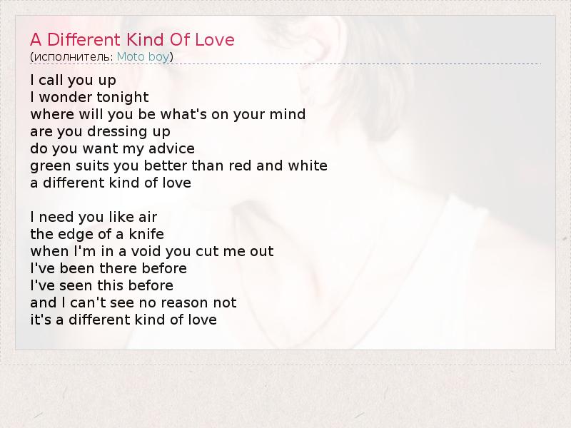 А как ты думаешь, о чем песня "A Different Kind Of Love" ?