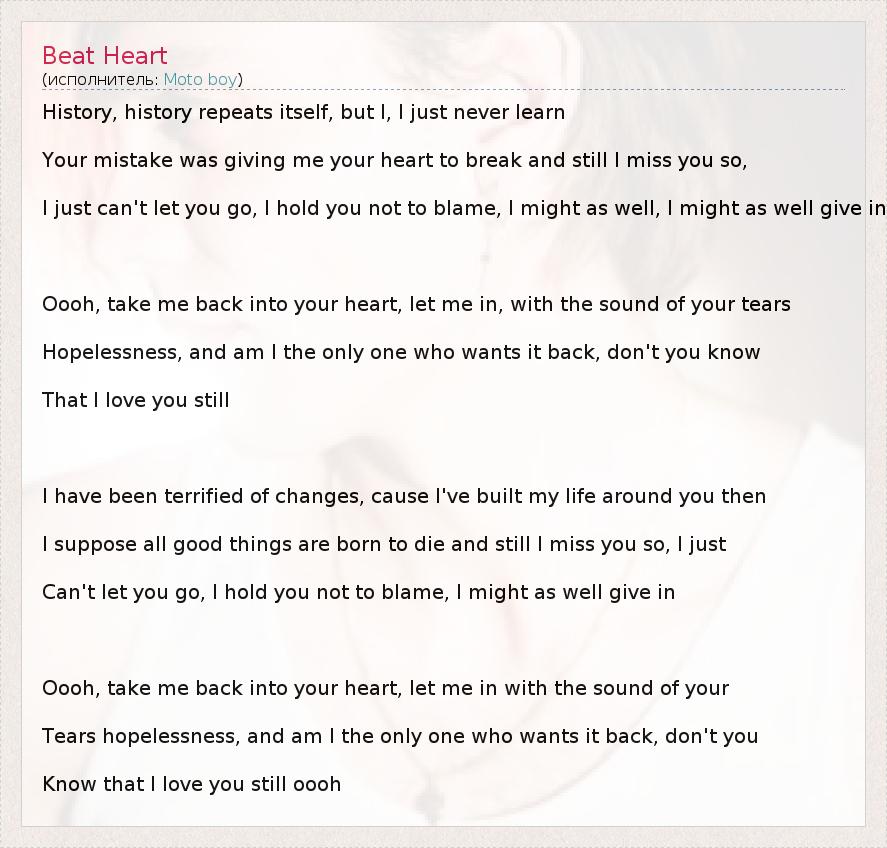 History, history repeats itself, but I, I just never learn Your mistake was giving me your heart to break and still I miss you so, I just can't let you go, I hold you not to blame, I might as well, I might as well give in Oooh, take me back into your heart, let me in, with the sound of your tears Hopelessness, and am I the only one who wants it back, don't you know That I love you still I have been terrified of changes, cause I've built my life around you then I suppose all good things are born to die and still I miss you so, I just Can't let you go, I hold you not to blame, I might as well give in Oooh, take me back into your heart, let me in with the sound of your Tears hopelessness, and am I the only one who wants it back, don't you Know that I love you still oooh