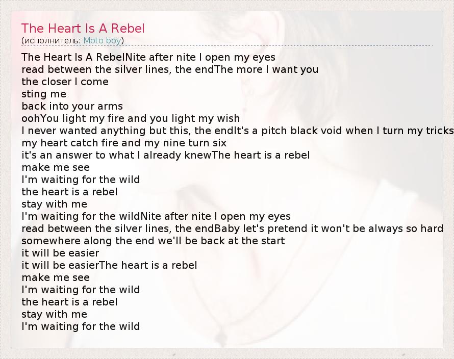 The Heart Is A RebelNite after nite I open my eyes read between the silver lines, the endThe more I want you the closer I come sting me back into your arms oohYou light my fire and you light my wish I never wanted anything but this, the endIt's a pitch black void when I turn my tricks my heart catch fire and my nine turn six it's an answer to what I already knewThe heart is a rebel make me see I'm waiting for the wild the heart is a rebel stay with me I'm waiting for the wildNite after nite I open my eyes read between the silver lines, the endBaby let's pretend it won't be always so hard somewhere along the end we'll be back at the start it will be easier it will be easierThe heart is a rebel make me see I'm waiting for the wild the heart is a rebel stay with me I'm waiting for the wild