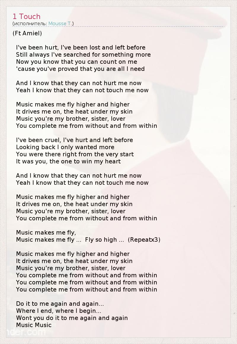 (Ft Amiel) I've been hurt, I've been lost and left before Still always I've searched for something more Now you know that you can count on me 'cause you've proved that you are all I need And I know that they can not hurt me now Yeah I know that they can not touch me now Music makes me fly higher and higher It drives me on, the heat under my skin Music you're my brother, sister, lover You complete me from without and from within I've been cruel, I've hurt and left before Looking back I only wanted more You were there right from the very start It was you, the one to win my heart And I know that they can not hurt me now Yeah I know that they can not touch me now Music makes me fly higher and higher It drives me on, the heat under my skin Music you're my brother, sister, lover You complete me from without and from within Music makes me fly, Music makes me fly ... Fly so high ... (Repeatx3) Music makes me fly higher and higher It drives me on, the heat under my skin Music you're my brother, sister, lover You complete me from without and from within You complete me from without and from within You complete me from without and from within Do it to me again and again... Where I end, where I begin... Wont you do it to me again and again Music Music