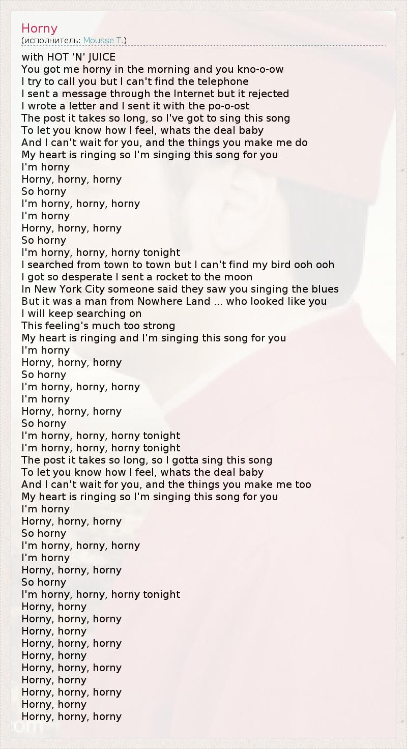 with HOT 'N' JUICE You got me horny in the morning and you kno-o-ow I try to call you but I can't find the telephone I sent a message through the Internet but it rejected I wrote a letter and I sent it with the po-o-ost The post it takes so long, so I've got to sing this song To let you know how I feel, whats the deal baby And I can't wait for you, and the things you make me do My heart is ringing so I'm singing this song for you I'm horny Horny, horny, horny So horny I'm horny, horny, horny I'm horny Horny, horny, horny So horny I'm horny, horny, horny tonight I searched from town to town but I can't find my bird ooh ooh I got so desperate I sent a rocket to the moon In New York City someone said they saw you singing the blues But it was a man from Nowhere Land ... who looked like you I will keep searching on This feeling's much too strong My heart is ringing and I'm singing this song for you I'm horny Horny, horny, horny So horny I'm horny, horny, horny I'm horny Horny, horny, horny So horny I'm horny, horny, horny tonight I'm horny, horny, horny tonight The post it takes so long, so I gotta sing this song To let you know how I feel, whats the deal baby And I can't wait for you, and the things you make me too My heart is ringing so I'm singing this song for you I'm horny Horny, horny, horny So horny I'm horny, horny, horny I'm horny Horny, horny, horny So horny I'm horny, horny, horny tonight Horny, horny Horny, horny, horny Horny, horny Horny, horny, horny Horny, horny Horny, horny, horny Horny, horny Horny, horny, horny Horny, horny Horny, horny, horny