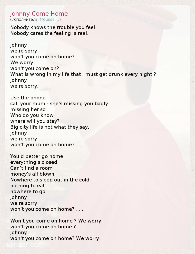 Nobody knows the trouble you feel Nobody cares the feeling is real. Johnny we're sorry won't you come on home? We worry won't you come on? What is wrong in my life that I must get drunk every night ? Johnny we're sorry. Use the phone call your mum - she's missing you badly missing her so Who do you know where will you stay? Big city life is not what they say. Johnny we're sorry won't you come on home? . . . You'd better go home everything's closed Can't find a room money's all blown. Nowhere to sleep out in the cold nothing to eat nowhere to go. Johnny we're sorry won't you come on home? . . . Won't you come on home ? We worry won't you come on home ? Johnny won't you come on home? We worry.
