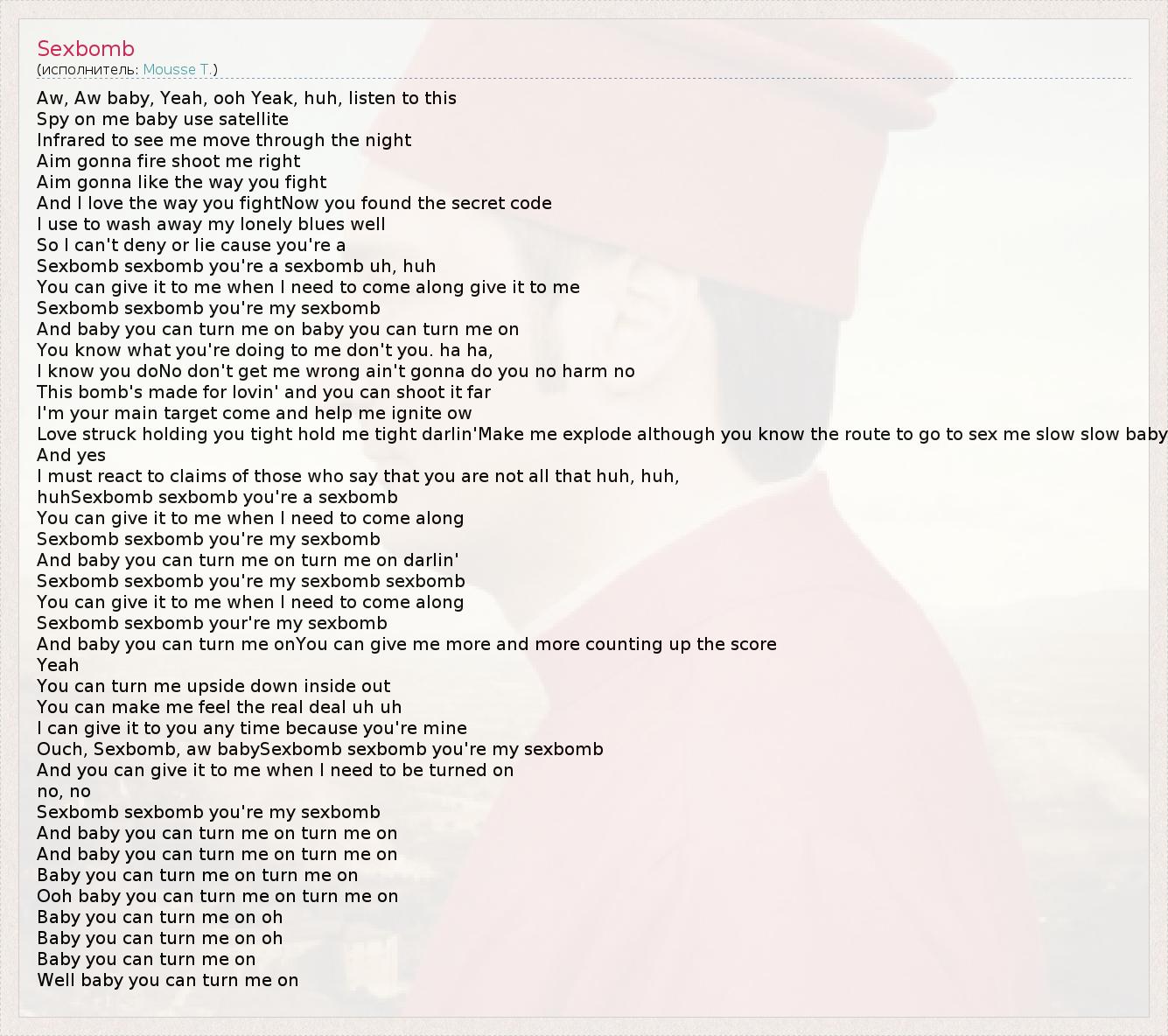 Aw, Aw baby, Yeah, ooh Yeak, huh, listen to this Spy on me baby use satellite Infrared to see me move through the night Aim gonna fire shoot me right Aim gonna like the way you fight And I love the way you fightNow you found the secret code I use to wash away my lonely blues well So I can't deny or lie cause you're a Sexbomb sexbomb you're a sexbomb uh, huh You can give it to me when I need to come along give it to me Sexbomb sexbomb you're my sexbomb And baby you can turn me on baby you can turn me on You know what you're doing to me don't you. ha ha, I know you doNo don't get me wrong ain't gonna do you no harm no This bomb's made for lovin' and you can shoot it far I'm your main target come and help me ignite ow Love struck holding you tight hold me tight darlin'Make me explode although you know the route to go to sex me slow slow baby And yes I must react to claims of those who say that you are not all that huh, huh, huhSexbomb sexbomb you're a sexbomb You can give it to me when I need to come along Sexbomb sexbomb you're my sexbomb And baby you can turn me on turn me on darlin' Sexbomb sexbomb you're my sexbomb sexbomb You can give it to me when I need to come along Sexbomb sexbomb your're my sexbomb And baby you can turn me onYou can give me more and more counting up the score Yeah You can turn me upside down inside out You can make me feel the real deal uh uh I can give it to you any time because you're mine Ouch, Sexbomb, aw babySexbomb sexbomb you're my sexbomb And you can give it to me when I need to be turned on no, no Sexbomb sexbomb you're my sexbomb And baby you can turn me on turn me on And baby you can turn me on turn me on Baby you can turn me on turn me on Ooh baby you can turn me on turn me on Baby you can turn me on oh Baby you can turn me on oh Baby you can turn me on Well baby you can turn me on