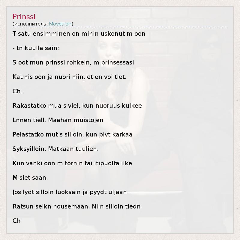 T satu ensimminen on mihin uskonut m oon - tn kuulla sain: S oot mun prinssi rohkein, m prinsessasi Kaunis oon ja nuori niin, et en voi tiet. Ch. Rakastatko mua s viel, kun nuoruus kulkee Lnnen tiell. Maahan muistojen Pelastatko mut s silloin, kun pivt karkaa Syksyilloin. Matkaan tuulien. Kun vanki oon m tornin tai itipuolta ilke M siet saan. Jos lydt silloin luoksein ja pyydt uljaan Ratsun selkn nousemaan. Niin silloin tiedn Ch