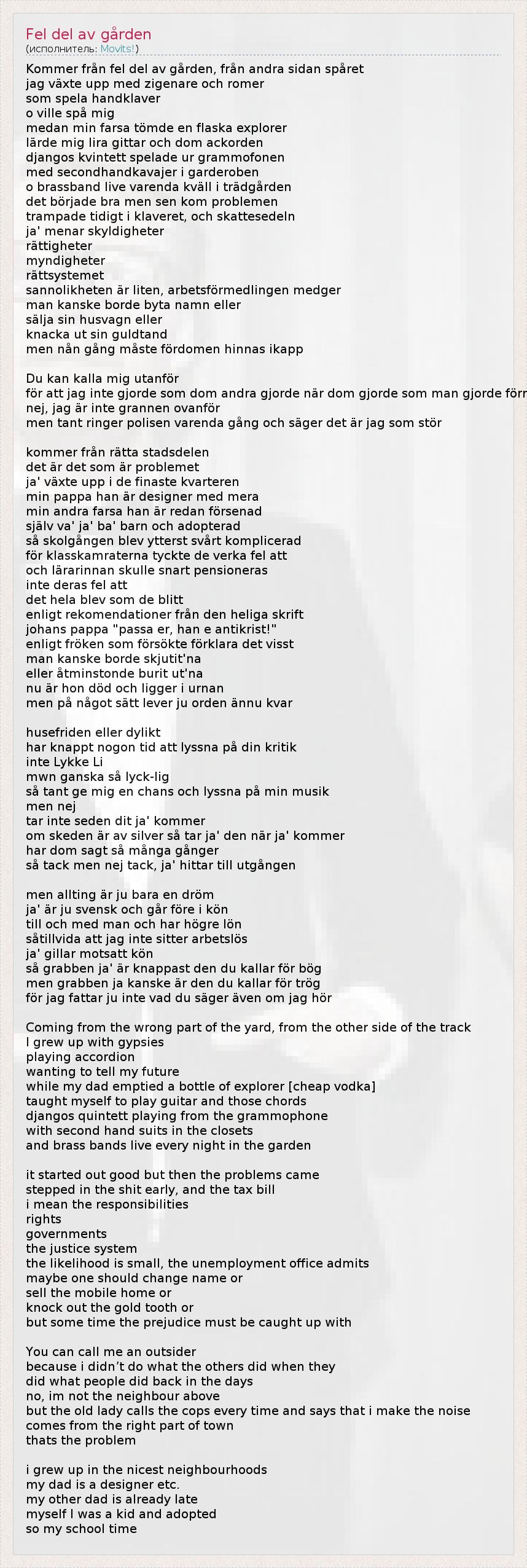Kommer från fel del av gården, från andra sidan spåret jag växte upp med zigenare och romer som spela handklaver o ville spå mig medan min farsa tömde en flaska explorer lärde mig lira gittar och dom ackorden djangos kvintett spelade ur grammofonen med secondhandkavajer i garderoben o brassband live varenda kväll i trädgården det började bra men sen kom problemen trampade tidigt i klaveret, och skattesedeln ja' menar skyldigheter rättigheter myndigheter rättsystemet sannolikheten är liten, arbetsförmedlingen medger man kanske borde byta namn eller sälja sin husvagn eller knacka ut sin guldtand men nån gång måste fördomen hinnas ikapp Du kan kalla mig utanför för att jag inte gjorde som dom andra gjorde när dom gjorde som man gjorde förr nej, jag är inte grannen ovanför men tant ringer polisen varenda gång och säger det är jag som stör kommer från rätta stadsdelen det är det som är problemet ja' växte upp i de finaste kvarteren min pappa han är designer med mera min andra farsa han är redan försenad själv va' ja' ba' barn och adopterad så skolgången blev ytterst svårt komplicerad för klasskamraterna tyckte de verka fel att och lärarinnan skulle snart pensioneras inte deras fel att det hela blev som de blitt enligt rekomendationer från den heliga skrift johans pappa "passa er, han e antikrist!" enligt fröken som försökte förklara det visst man kanske borde skjutit'na eller åtminstonde burit ut'na nu är hon död och ligger i urnan men på något sätt lever ju orden ännu kvar husefriden eller dylikt har knappt nogon tid att lyssna på din kritik inte Lykke Li mwn ganska så lyck-lig så tant ge mig en chans och lyssna på min musik men nej tar inte seden dit ja' kommer om skeden är av silver så tar ja' den när ja' kommer har dom sagt så många gånger så tack men nej tack, ja' hittar till utgången men allting är ju bara en dröm ja' är ju svensk och går före i kön till och med man och har högre lön såtillvida att jag inte sitter arbetslös ja' gillar motsatt kön så grabben ja' är knappast den du kallar för bög men grabben ja kanske är den du kallar för trög för jag fattar ju inte vad du säger även om jag hör Coming from the wrong part of the yard, from the other side of the track I grew up with gypsies playing accordion wanting to tell my future while my dad emptied a bottle of explorer [cheap vodka] taught myself to play guitar and those chords djangos quintett playing from the grammophone with second hand suits in the closets and brass bands live every night in the garden it started out good but then the problems came stepped in the shit early, and the tax bill i mean the responsibilities rights governments the justice system the likelihood is small, the unemployment office admits maybe one should change name or sell the mobile home or knock out the gold tooth or but some time the prejudice must be caught up with You can call me an outsider because i didn’t do what the others did when they did what people did back in the days no, im not the neighbour above but the old lady calls the cops every time and says that i make the noise comes from the right part of town thats the problem i grew up in the nicest neighbourhoods my dad is a designer etc. my other dad is already late myself I was a kid and adopted so my school time