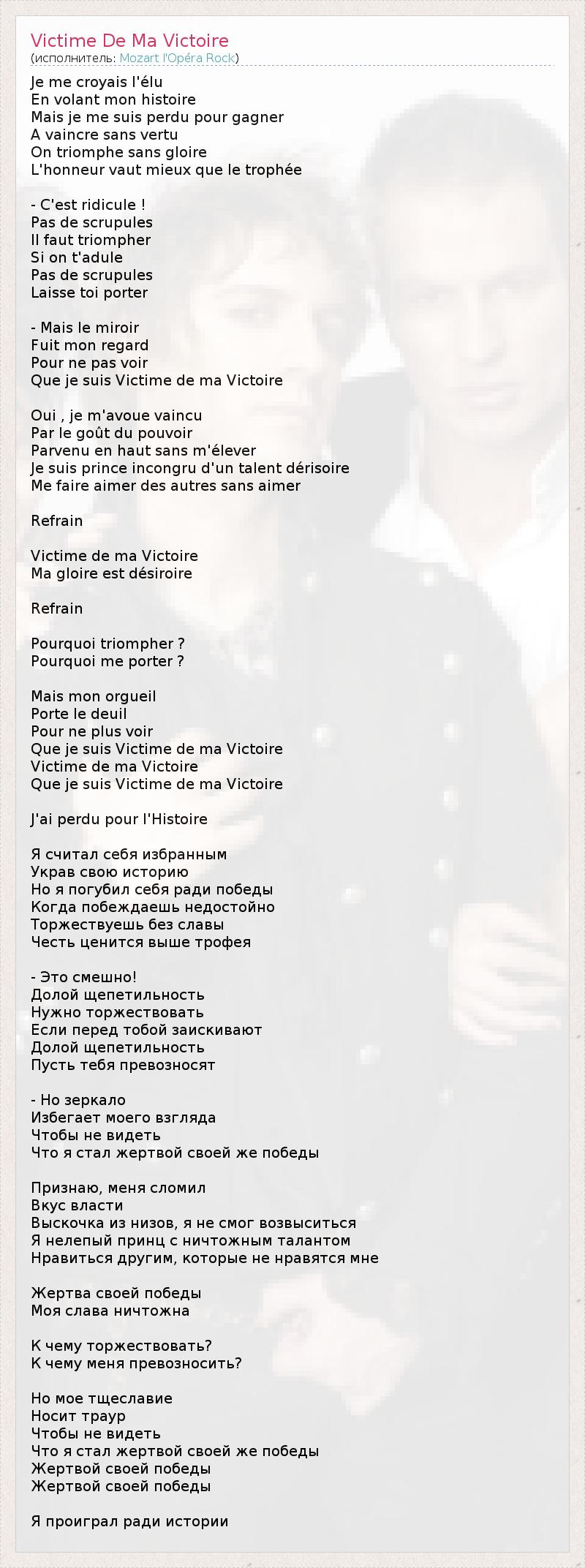 Je me croyais l'élu En volant mon histoire Mais je me suis perdu pour gagner A vaincre sans vertu On triomphe sans gloire L'honneur vaut mieux que le trophée - C'est ridicule ! Pas de scrupules Il faut triompher Si on t'adule Pas de scrupules Laisse toi porter - Mais le miroir Fuit mon regard Pour ne pas voir Que je suis Victime de ma Victoire Oui , je m'avoue vaincu Par le goût du pouvoir Parvenu en haut sans m'élever Je suis prince incongru d'un talent dérisoire Me faire aimer des autres sans aimer Refrain Victime de ma Victoire Ma gloire est désiroire Refrain Pourquoi triompher ? Pourquoi me porter ? Mais mon orgueil Porte le deuil Pour ne plus voir Que je suis Victime de ma Victoire Victime de ma Victoire Que je suis Victime de ma Victoire J'ai perdu pour l'Histoire Я считал себя избранным Украв свою историю Но я погубил себя ради победы Когда побеждаешь недостойно Торжествуешь без славы Честь ценится выше трофея - Это смешно! Долой щепетильность Нужно торжествовать Если перед тобой заискивают Долой щепетильность Пусть тебя превозносят - Но зеркало Избегает моего взгляда Чтобы не видеть Что я стал жертвой своей же победы Признаю, меня сломил Вкус власти Выскочка из низов, я не смог возвыситься Я нелепый принц с ничтожным талантом Нравиться другим, которые не нравятся мне Жертва своей победы Моя слава ничтожна К чему торжествовать? К чему меня превозносить? Но мое тщеславие Носит траур Чтобы не видеть Что я стал жертвой своей же победы Жертвой своей победы Жертвой своей победы Я проиграл ради истории