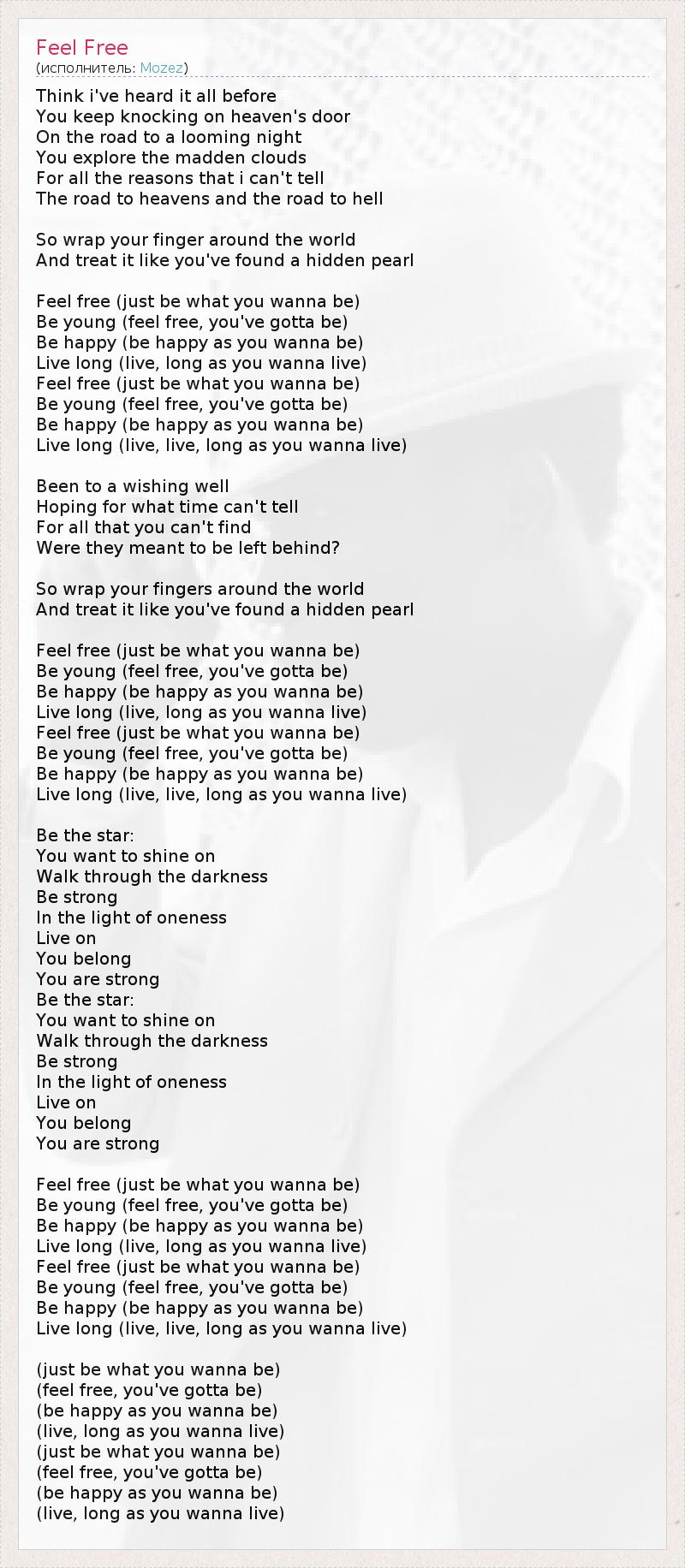 Think i've heard it all before You keep knocking on heaven's door On the road to a looming night You explore the madden clouds For all the reasons that i can't tell The road to heavens and the road to hell So wrap your finger around the world And treat it like you've found a hidden pearl Feel free (just be what you wanna be) Be young (feel free, you've gotta be) Be happy (be happy as you wanna be) Live long (live, long as you wanna live) Feel free (just be what you wanna be) Be young (feel free, you've gotta be) Be happy (be happy as you wanna be) Live long (live, live, long as you wanna live) Been to a wishing well Hoping for what time can't tell For all that you can't find Were they meant to be left behind? So wrap your fingers around the world And treat it like you've found a hidden pearl Feel free (just be what you wanna be) Be young (feel free, you've gotta be) Be happy (be happy as you wanna be) Live long (live, long as you wanna live) Feel free (just be what you wanna be) Be young (feel free, you've gotta be) Be happy (be happy as you wanna be) Live long (live, live, long as you wanna live) Be the star: You want to shine on Walk through the darkness Be strong In the light of oneness Live on You belong You are strong Be the star: You want to shine on Walk through the darkness Be strong In the light of oneness Live on You belong You are strong Feel free (just be what you wanna be) Be young (feel free, you've gotta be) Be happy (be happy as you wanna be) Live long (live, long as you wanna live) Feel free (just be what you wanna be) Be young (feel free, you've gotta be) Be happy (be happy as you wanna be) Live long (live, live, long as you wanna live) (just be what you wanna be) (feel free, you've gotta be) (be happy as you wanna be) (live, long as you wanna live) (just be what you wanna be) (feel free, you've gotta be) (be happy as you wanna be) (live, long as you wanna live)