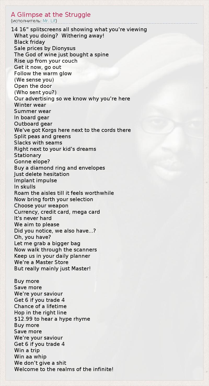 14 16" splitscreens all showing what you're viewing What you doing? Withering away! Black friday Sale prices by Dionysus The God of wine just bought a spine Rise up from your couch Get it now, go out Follow the warm glow (We sense you) Open the door (Who sent you?) Our advertising so we know why you're here Winter wear Summer wear In board gear Outboard gear We've got Korgs here next to the cords there Split peas and greens Slacks with seams Right next to your kid's dreams Stationary Gonne elope? Buy a diamond ring and envelopes Just delete hesitation Implant impulse In skulls Roam the aisles till it feels worthwhile Now bring forth your selection Choose your weapon Currency, credit card, mega card It's never hard We aim to please Did you notice, we also have...? Oh, you have? Let me grab a bigger bag Now walk through the scanners Keep us in your daily planner We're a Master Store But really mainly just Master! Buy more Save more We're your saviour Get 6 if you trade 4 Chance of a lifetime Hop in the right line $12.99 to hear a hype rhyme Buy more Save more We're your saviour Get 6 if you trade 4 Win a trip Win aa whip We don't give a shit Welcome to the realms of the infinite!