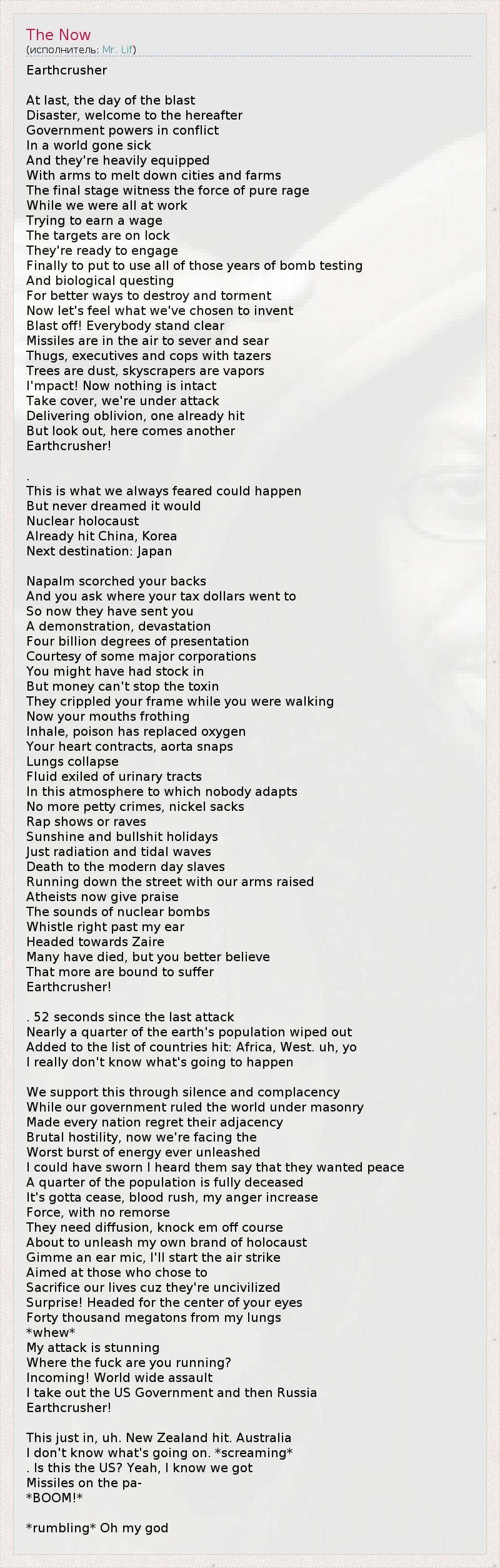 Earthcrusher At last, the day of the blast Disaster, welcome to the hereafter Government powers in conflict In a world gone sick And they're heavily equipped With arms to melt down cities and farms The final stage witness the force of pure rage While we were all at work Trying to earn a wage The targets are on lock They're ready to engage Finally to put to use all of those years of bomb testing And biological questing For better ways to destroy and torment Now let's feel what we've chosen to invent Blast off! Everybody stand clear Missiles are in the air to sever and sear Thugs, executives and cops with tazers Trees are dust, skyscrapers are vapors I'mpact! Now nothing is intact Take cover, we're under attack Delivering oblivion, one already hit But look out, here comes another Earthcrusher! . This is what we always feared could happen But never dreamed it would Nuclear holocaust Already hit China, Korea Next destination: Japan Napalm scorched your backs And you ask where your tax dollars went to So now they have sent you A demonstration, devastation Four billion degrees of presentation Courtesy of some major corporations You might have had stock in But money can't stop the toxin They crippled your frame while you were walking Now your mouths frothing Inhale, poison has replaced oxygen Your heart contracts, aorta snaps Lungs collapse Fluid exiled of urinary tracts In this atmosphere to which nobody adapts No more petty crimes, nickel sacks Rap shows or raves Sunshine and bullshit holidays Just radiation and tidal waves Death to the modern day slaves Running down the street with our arms raised Atheists now give praise The sounds of nuclear bombs Whistle right past my ear Headed towards Zaire Many have died, but you better believe That more are bound to suffer Earthcrusher! . 52 seconds since the last attack Nearly a quarter of the earth's population wiped out Added to the list of countries hit: Africa, West. uh, yo I really don't know what's going to happen We support this through silence and complacency While our government ruled the world under masonry Made every nation regret their adjacency Brutal hostility, now we're facing the Worst burst of energy ever unleashed I could have sworn I heard them say that they wanted peace A quarter of the population is fully deceased It's gotta cease, blood rush, my anger increase Force, with no remorse They need diffusion, knock em off course About to unleash my own brand of holocaust Gimme an ear mic, I'll start the air strike Aimed at those who chose to Sacrifice our lives cuz they're uncivilized Surprise! Headed for the center of your eyes Forty thousand megatons from my lungs *whew* My attack is stunning Where the fuck are you running? Incoming! World wide assault I take out the US Government and then Russia Earthcrusher! This just in, uh. New Zealand hit. Australia I don't know what's going on. *screaming* . Is this the US? Yeah, I know we got Missiles on the pa- *BOOM!* *rumbling* Oh my god