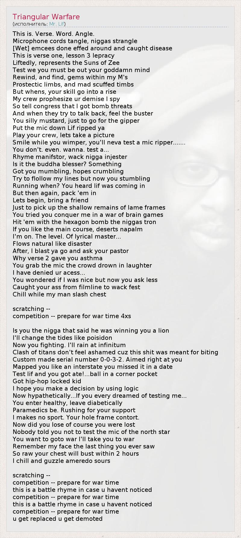 This is. Verse. Word. Angle. Microphone cords tangle, niggas strangle [Wet] emcees done effed around and caught disease This is verse one, lesson 3 lepracy Liftedly, represents the Suns of Zee Test we you must be out your goddamn mind Rewind, and find, gems within my M's Prostectic limbs, and mad scuffed timbs But whens, your skill go into a rise My crew prophesize ur demise I spy So tell congress that I got bomb threats And when they try to talk back, feel the buster You silly mustard, just to go for the gipper Put the mic down Lif ripped ya Play your crew, lets take a picture Smile while you wimper, you'll neva test a mic ripper....... You don't. even. wanna. test a... Rhyme manifstor, wack nigga injester Is it the buddha blesser? Something Got you mumbling, hopes crumbling Try to flollow my lines but now you stumbling Running when? You heard lif was coming in But then again, pack 'em in Lets begin, bring a friend Just to pick up the shallow remains of lame frames You tried you conquer me in a war of brain games Hit 'em with the hexagon bomb the niggas tron If you like the main course, deserts napalm I'm on. The level. Of lyrical master... Flows natural like disaster After, I blast ya go and ask your pastor Why verse 2 gave you asthma You grab the mic the crowd drown in laughter I have denied ur acess... You wondered if I was nice but now you ask less Caught your ass from filmline to wack fest Chill while my man slash chest scratching -- competition -- prepare for war time 4xs Is you the nigga that said he was winning you a lion I'll change the tides like poisidon Now you fighting. I'll rain at infinitum Clash of titans don't feel ashamed cuz this shit was meant for biting Custom made serial number 0-0-3-2. Aimed right at you Mapped you like an interstate you missed it in a date Test lif and you got ate!...ball in a corner pocket Got hip-hop locked kid I hope you make a decision by using logic Now hypathetically...If you every dreamed of testing me... You enter healthy, leave diabetically Paramedics be. Rushing for your support I makes no sport. Your hole frame contort. Now did you lose of course you were lost Nobody told you not to test the mic of the north star You want to goto war I'll take you to war Remember my face the last thing you ever saw So raw your chest will bust within 2 hours I chill and guzzle ameredo sours scratching -- competition -- prepare for war time this is a battle rhyme in case u havent noticed competition -- prepare for war time this is a battle rhyme in case u havent noticed competition -- prepare for war time u get replaced u get demoted