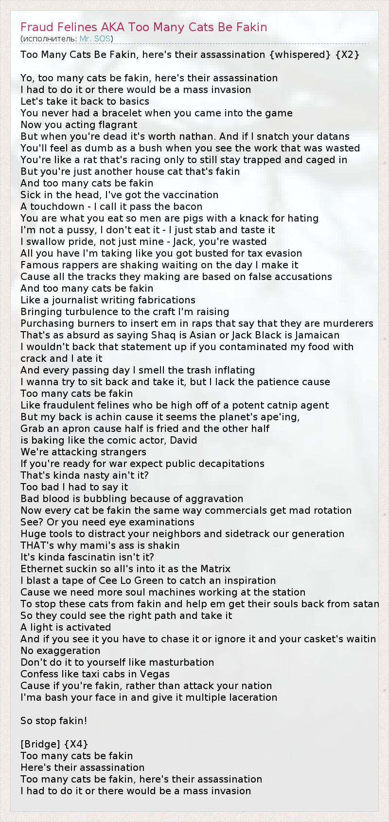 А как ты думаешь, о чем песня "Fraud Felines AKA Too Many Cats Be Fakin" ?