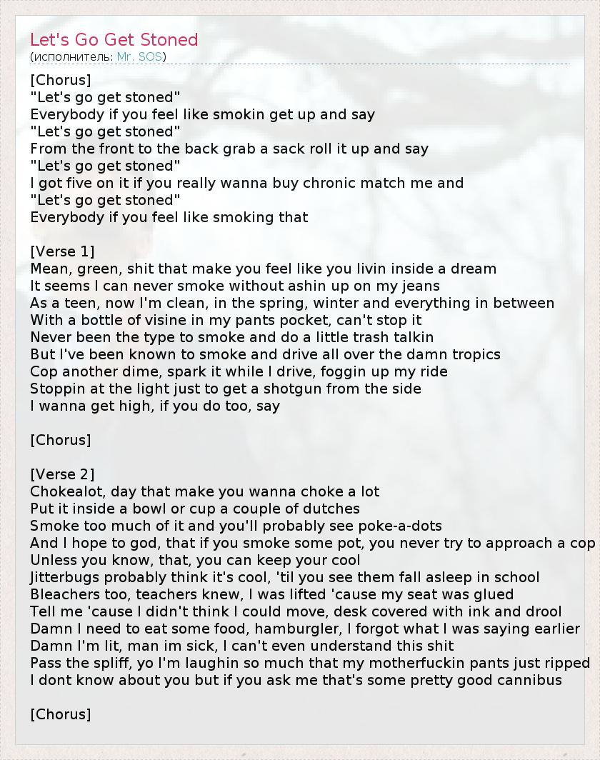 [Chorus] "Let's go get stoned" Everybody if you feel like smokin get up and say "Let's go get stoned" From the front to the back grab a sack roll it up and say "Let's go get stoned" I got five on it if you really wanna buy chronic match me and "Let's go get stoned" Everybody if you feel like smoking that [Verse 1] Mean, green, shit that make you feel like you livin inside a dream It seems I can never smoke without ashin up on my jeans As a teen, now I'm clean, in the spring, winter and everything in between With a bottle of visine in my pants pocket, can't stop it Never been the type to smoke and do a little trash talkin But I've been known to smoke and drive all over the damn tropics Cop another dime, spark it while I drive, foggin up my ride Stoppin at the light just to get a shotgun from the side I wanna get high, if you do too, say [Chorus] [Verse 2] Chokealot, day that make you wanna choke a lot Put it inside a bowl or cup a couple of dutches Smoke too much of it and you'll probably see poke-a-dots And I hope to god, that if you smoke some pot, you never try to approach a cop Unless you know, that, you can keep your cool Jitterbugs probably think it's cool, 'til you see them fall asleep in school Bleachers too, teachers knew, I was lifted 'cause my seat was glued Tell me 'cause I didn't think I could move, desk covered with ink and drool Damn I need to eat some food, hamburgler, I forgot what I was saying earlier Damn I'm lit, man im sick, I can't even understand this shit Pass the spliff, yo I'm laughin so much that my motherfuckin pants just ripped I dont know about you but if you ask me that's some pretty good cannibus [Chorus]