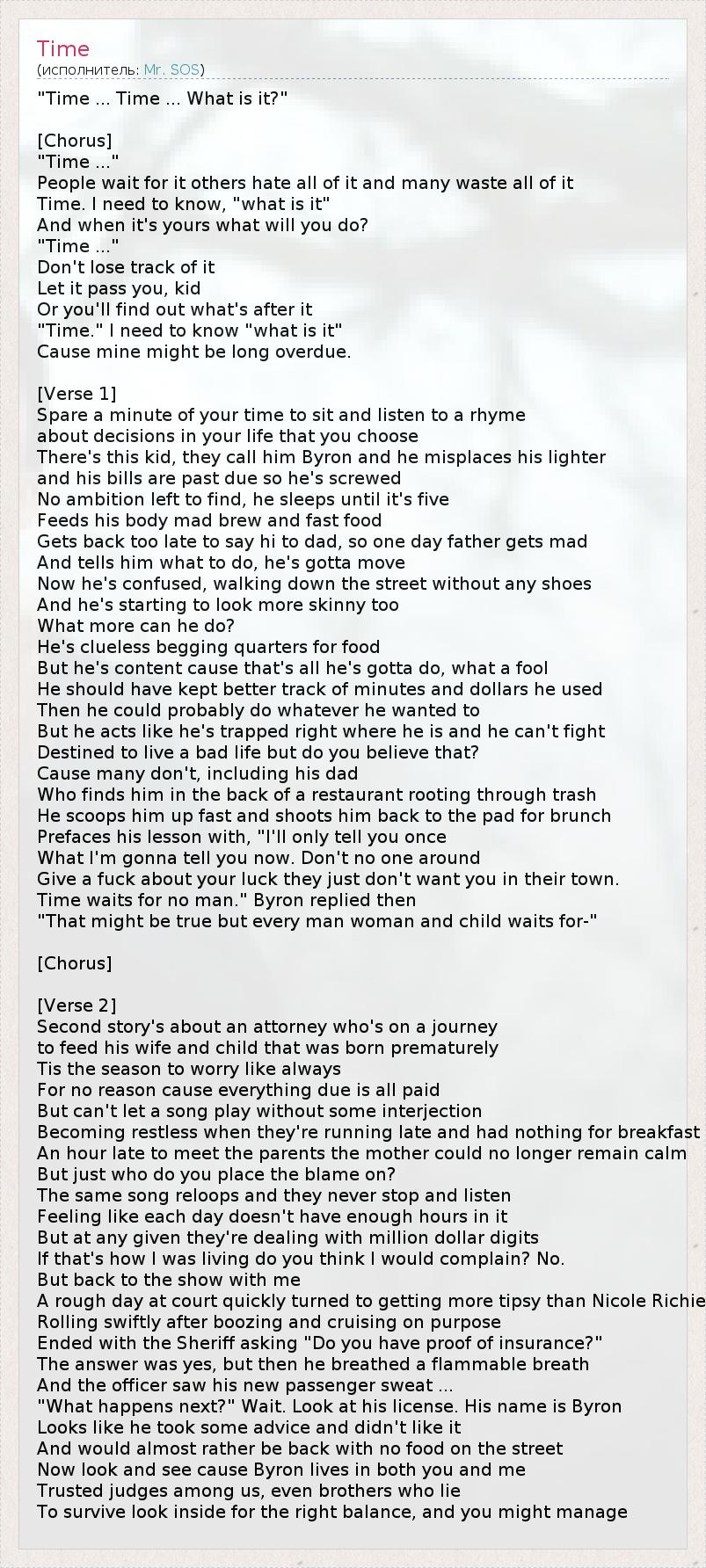 "Time ... Time ... What is it?" [Chorus] "Time ..." People wait for it others hate all of it and many waste all of it Time. I need to know, "what is it" And when it's yours what will you do? "Time ..." Don't lose track of it Let it pass you, kid Or you'll find out what's after it "Time." I need to know "what is it" Cause mine might be long overdue. [Verse 1] Spare a minute of your time to sit and listen to a rhyme about decisions in your life that you choose There's this kid, they call him Byron and he misplaces his lighter and his bills are past due so he's screwed No ambition left to find, he sleeps until it's five Feeds his body mad brew and fast food Gets back too late to say hi to dad, so one day father gets mad And tells him what to do, he's gotta move Now he's confused, walking down the street without any shoes And he's starting to look more skinny too What more can he do? He's clueless begging quarters for food But he's content cause that's all he's gotta do, what a fool He should have kept better track of minutes and dollars he used Then he could probably do whatever he wanted to But he acts like he's trapped right where he is and he can't fight Destined to live a bad life but do you believe that? Cause many don't, including his dad Who finds him in the back of a restaurant rooting through trash He scoops him up fast and shoots him back to the pad for brunch Prefaces his lesson with, "I'll only tell you once What I'm gonna tell you now. Don't no one around Give a fuck about your luck they just don't want you in their town. Time waits for no man." Byron replied then "That might be true but every man woman and child waits for-" [Chorus] [Verse 2] Second story's about an attorney who's on a journey to feed his wife and child that was born prematurely Tis the season to worry like always For no reason cause everything due is all paid But can't let a song play without some interjection Becoming restless when they're running late and had nothing for breakfast An hour late to meet the parents the mother could no longer remain calm But just who do you place the blame on? The same song reloops and they never stop and listen Feeling like each day doesn't have enough hours in it But at any given they're dealing with million dollar digits If that's how I was living do you think I would complain? No. But back to the show with me A rough day at court quickly turned to getting more tipsy than Nicole Richie Rolling swiftly after boozing and cruising on purpose Ended with the Sheriff asking "Do you have proof of insurance?" The answer was yes, but then he breathed a flammable breath And the officer saw his new passenger sweat ... "What happens next?" Wait. Look at his license. His name is Byron Looks like he took some advice and didn't like it And would almost rather be back with no food on the street Now look and see cause Byron lives in both you and me Trusted judges among us, even brothers who lie To survive look inside for the right balance, and you might manage